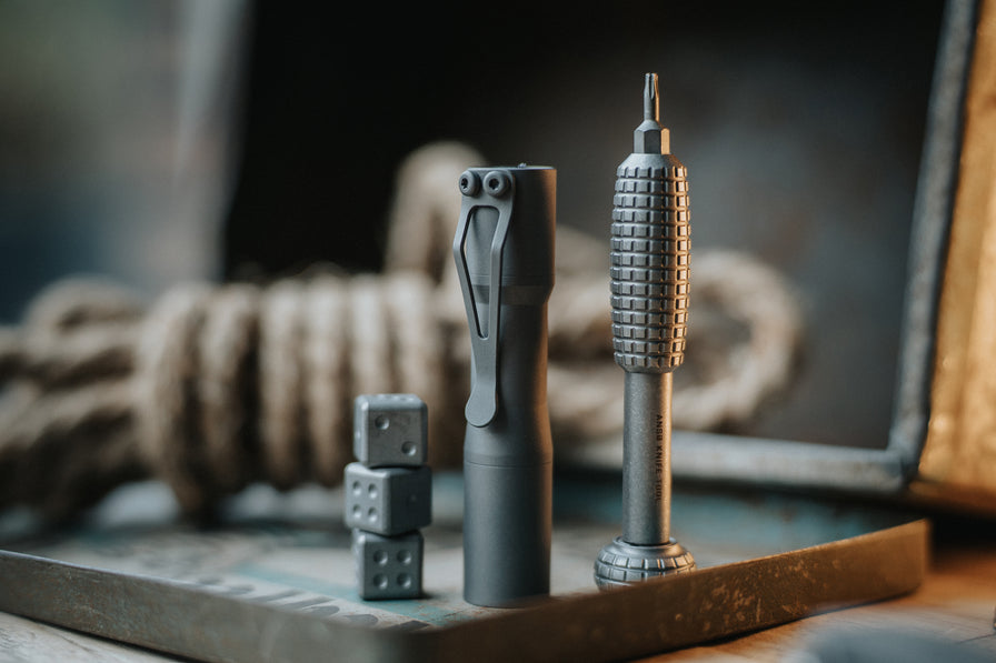 Stifte, Werkzeuge und Notizbuch in einem kompakten Paket