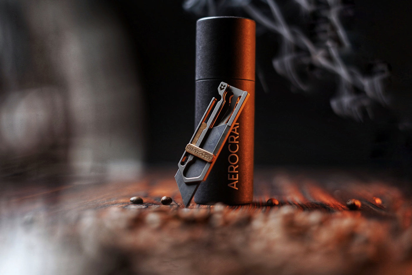 This minimal everyday carry knife is made up of only two parts and a disposable utility blade. The unique design doesn’t use any fasteners, which means no tools are needed to switch out the blade. The skeletonized frame is designed like an airframe, removing all unnecessary material to keep the knife compact and lightweight.