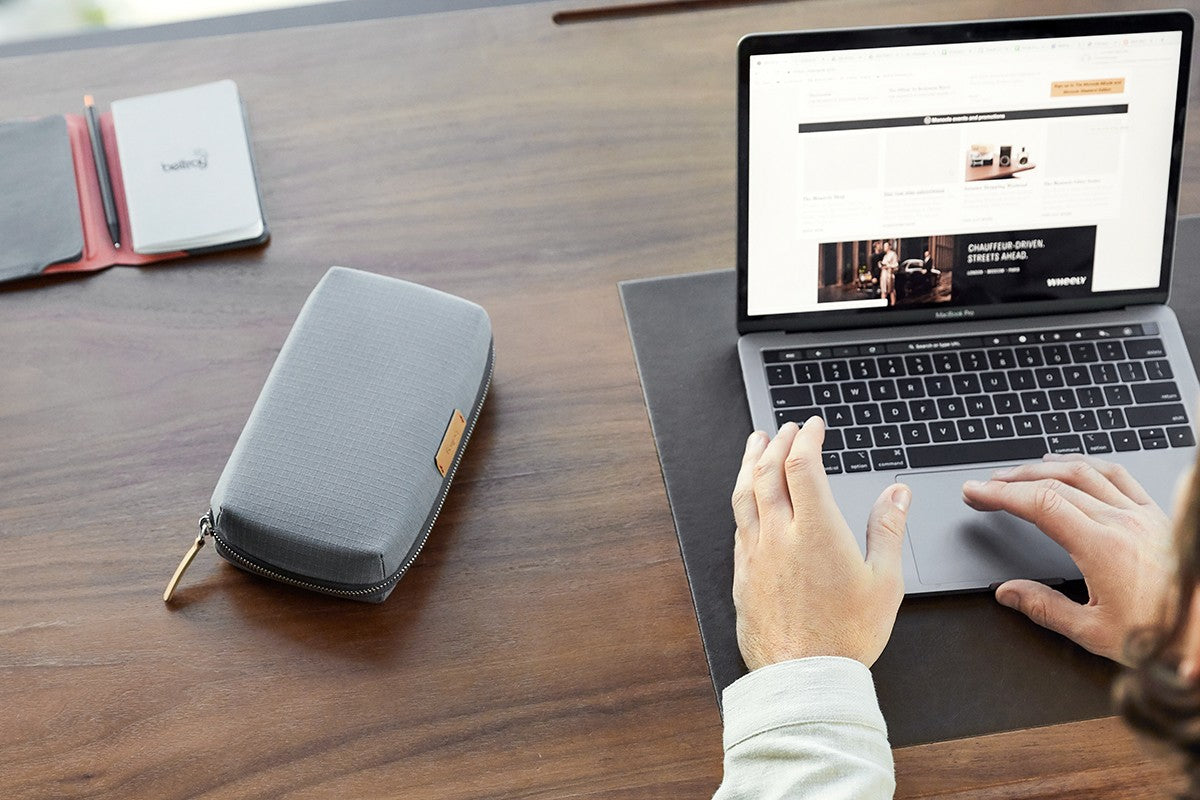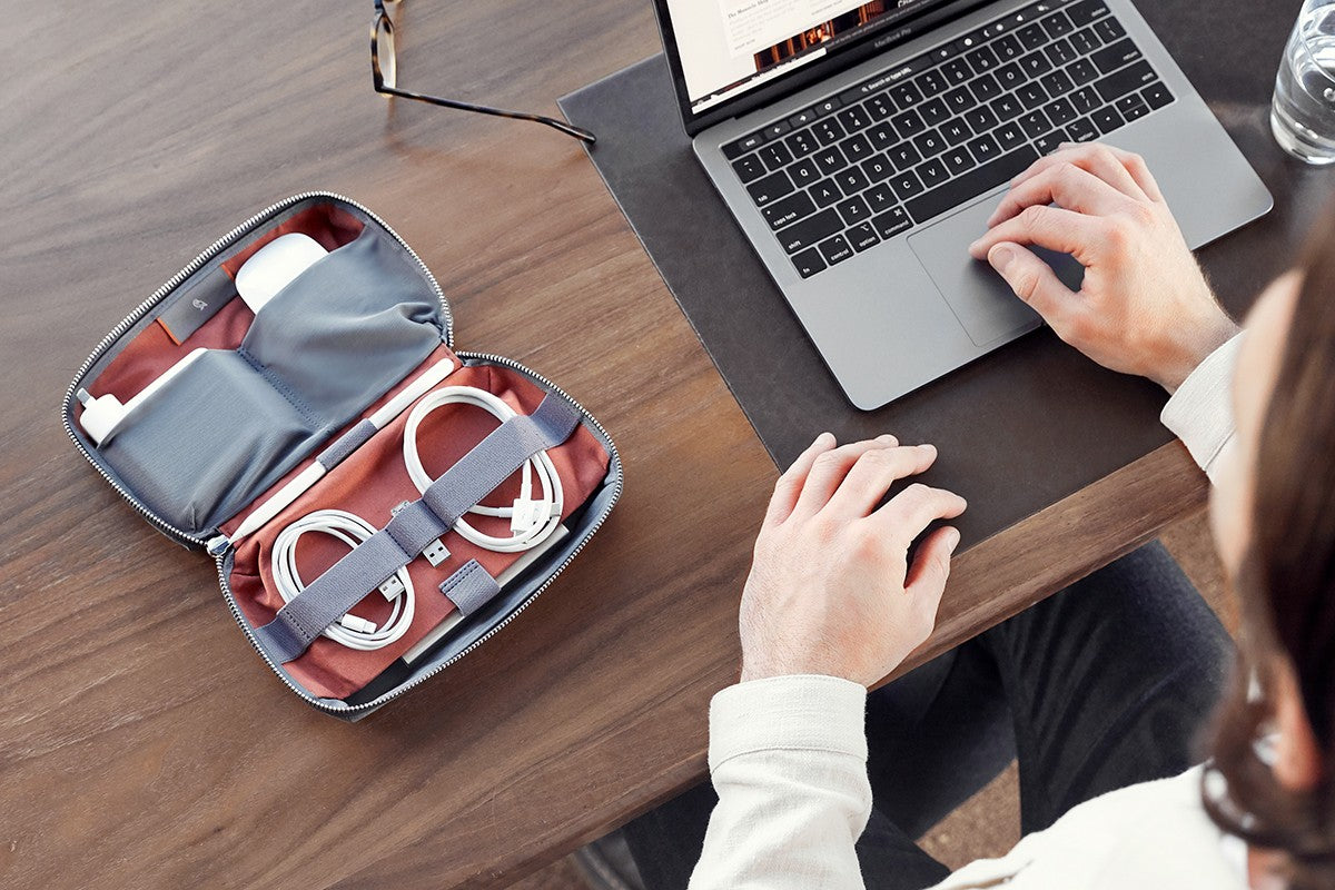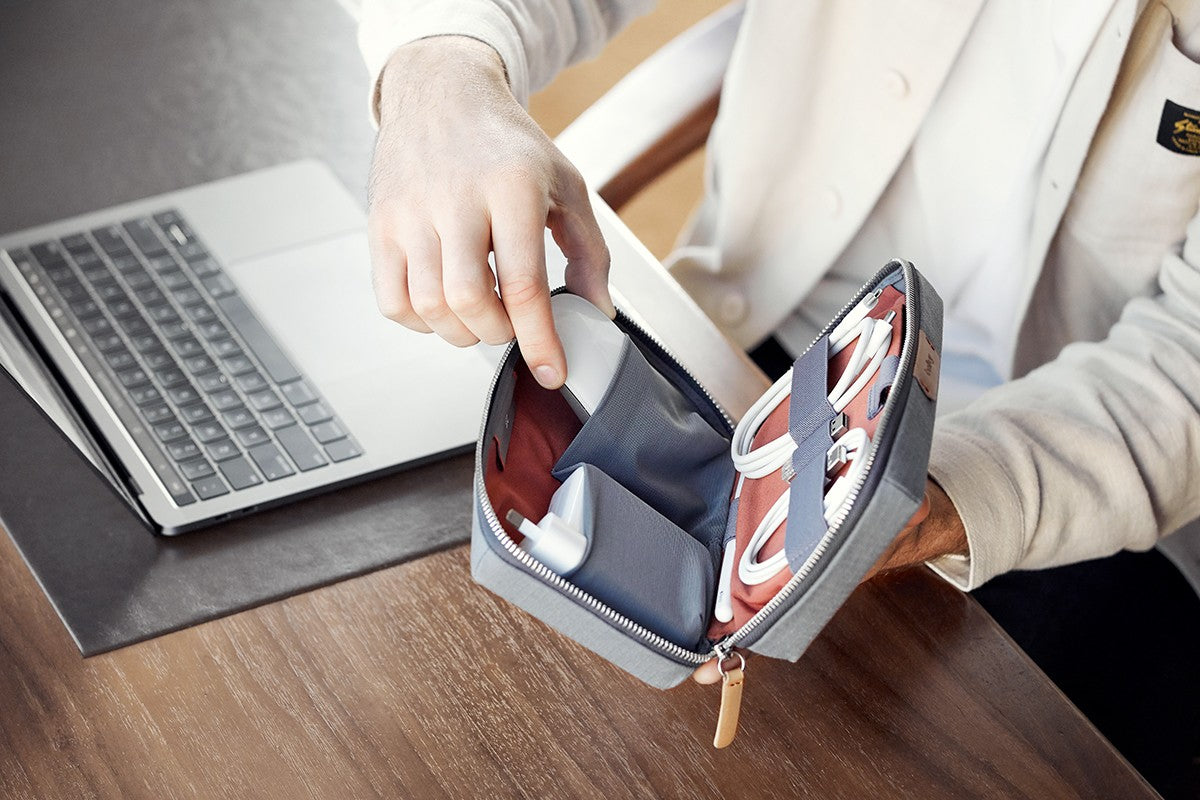 Das Tech Kit organisiert Ihre Technik-Accessoires ohne Kabelsalat – alles bleibt ordentlich und sortiert. Das Kit lässt sich flach aufklappen, sodass Sie vollen und einfachen Zugriff auf Ihr Equipment haben. Eine magnetische Einschubtasche passt perfekt für Ihre Powerbank, eine dehnbare Netztasche nimmt eine Maus auf, und ein elastischer Streifen organisiert Ihre Kabel. Das Layout ist darauf ausgelegt, größere Gegenstände von Kabeln und Ohrhörern zu trennen, um ein Durcheinander zu vermeiden. Eine schwebende Wand im Inneren dehnt sich elastisch aus, um unterschiedlich große Gegenstände aufzunehmen, ohne überflüssigen Platz zu beanspruchen.