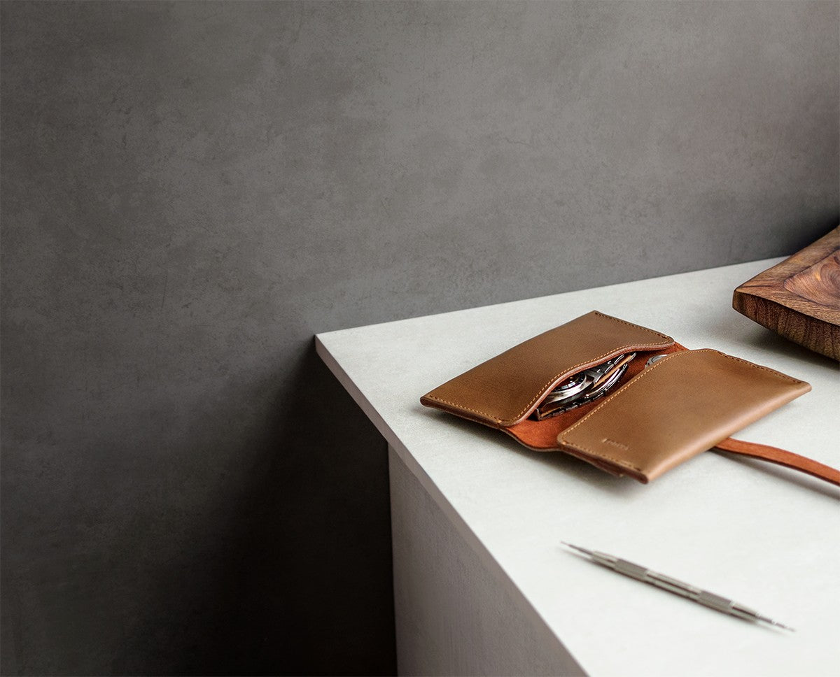 Der Roll besteht aus italienischem, pflanzlich gegerbtem Buttero-Leder und ist mit italienischem, wasserdichtem Wildleder gefüttert. Die Seiten der Fächer sind für zusätzliche Stabilität verstärkt vernäht, und der Roll wird mit einem Lederriemen gesichert. Die Kanten sind von Hand mit Bienenwachs poliert, um eine glatte Oberfläche zu gewährleisten. Der Roll wird mit zwei ledernen Uhrenkissen geliefert, die mit Wildleder gefüttert sind, um die Gehäuseböden deiner Uhren zu schützen. Das Leder entwickelt im Laufe der Zeit eine schöne Patina durch die Einwirkung der Elemente.