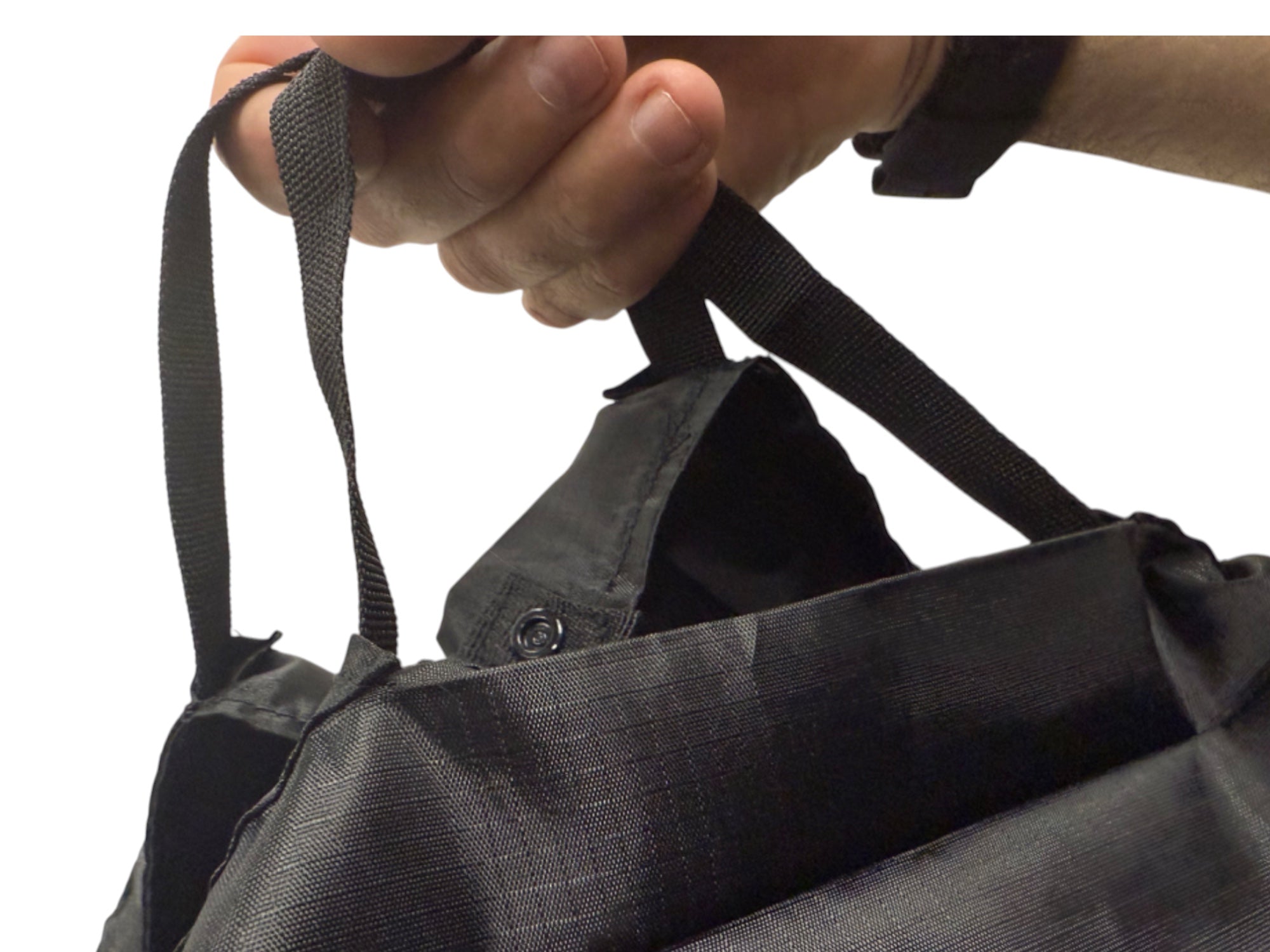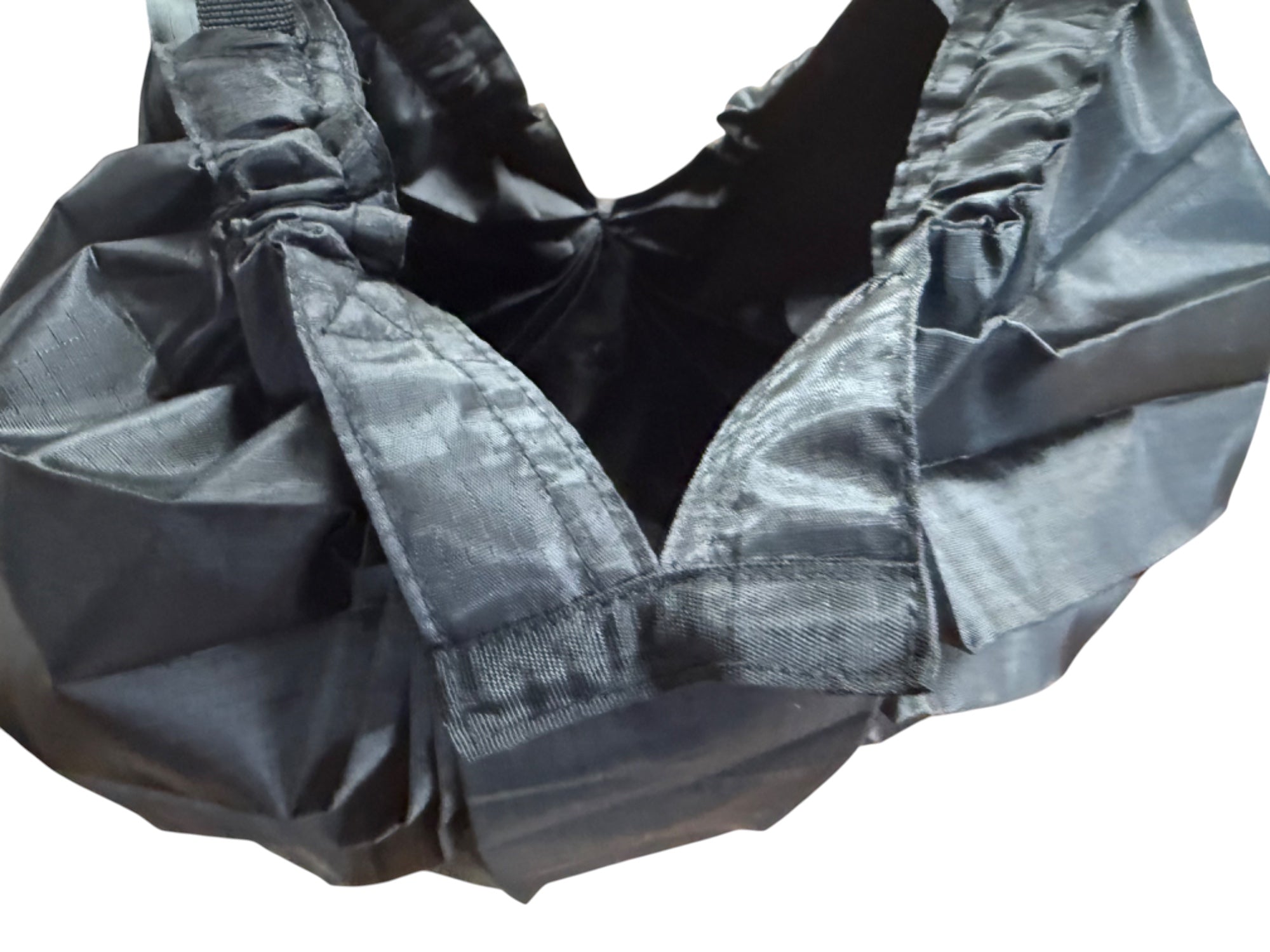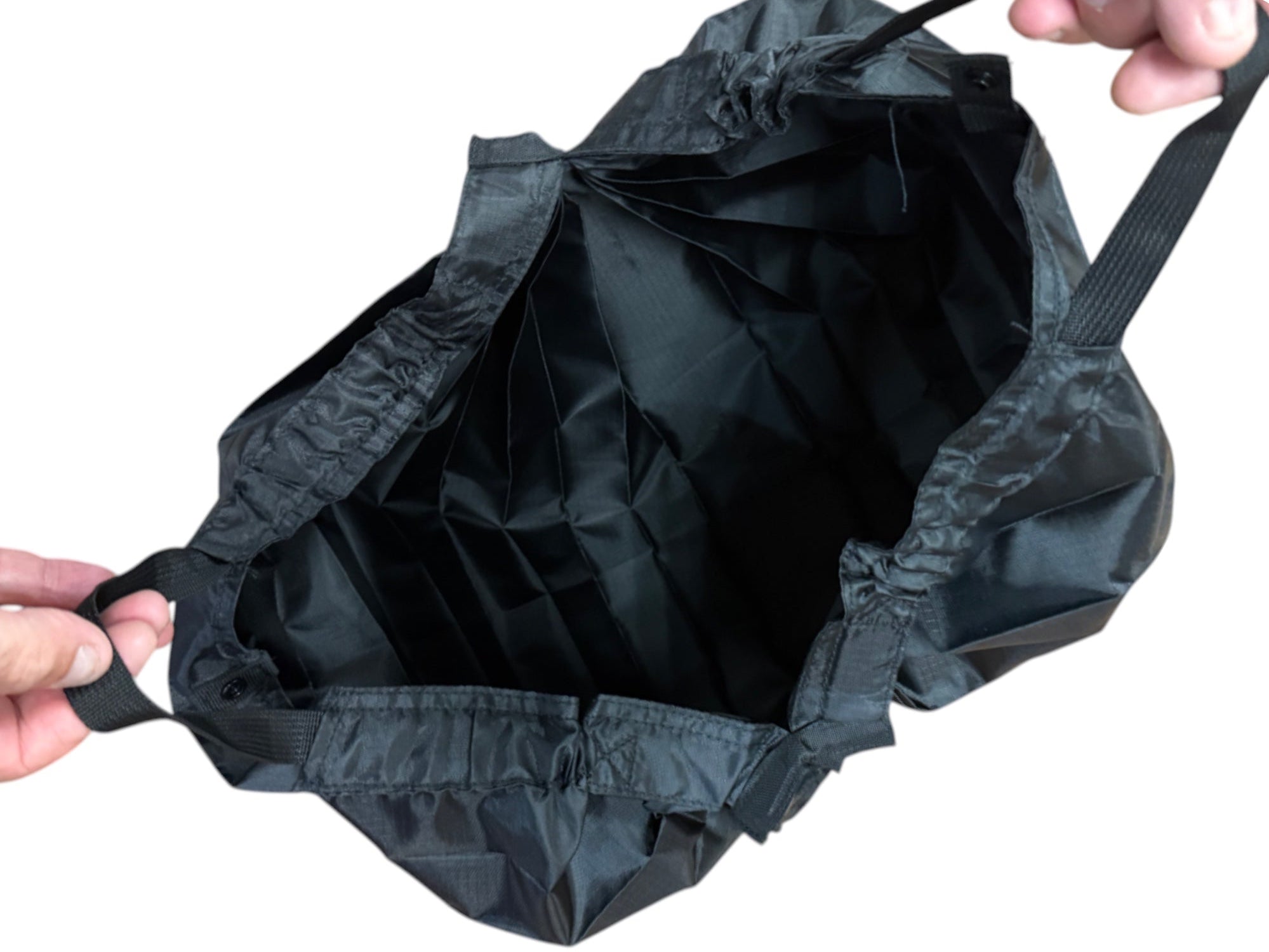 When folded, the bag measures 8,6 × 5,1 cm (approx. 164 cm³). Once deployed, it expands into a large-capacity bag measuring 66 cm wide by 45,7 cm in diameter. The total internal volume when fully opened is approximately 50 liters, offering more carrying space than most backpacks.