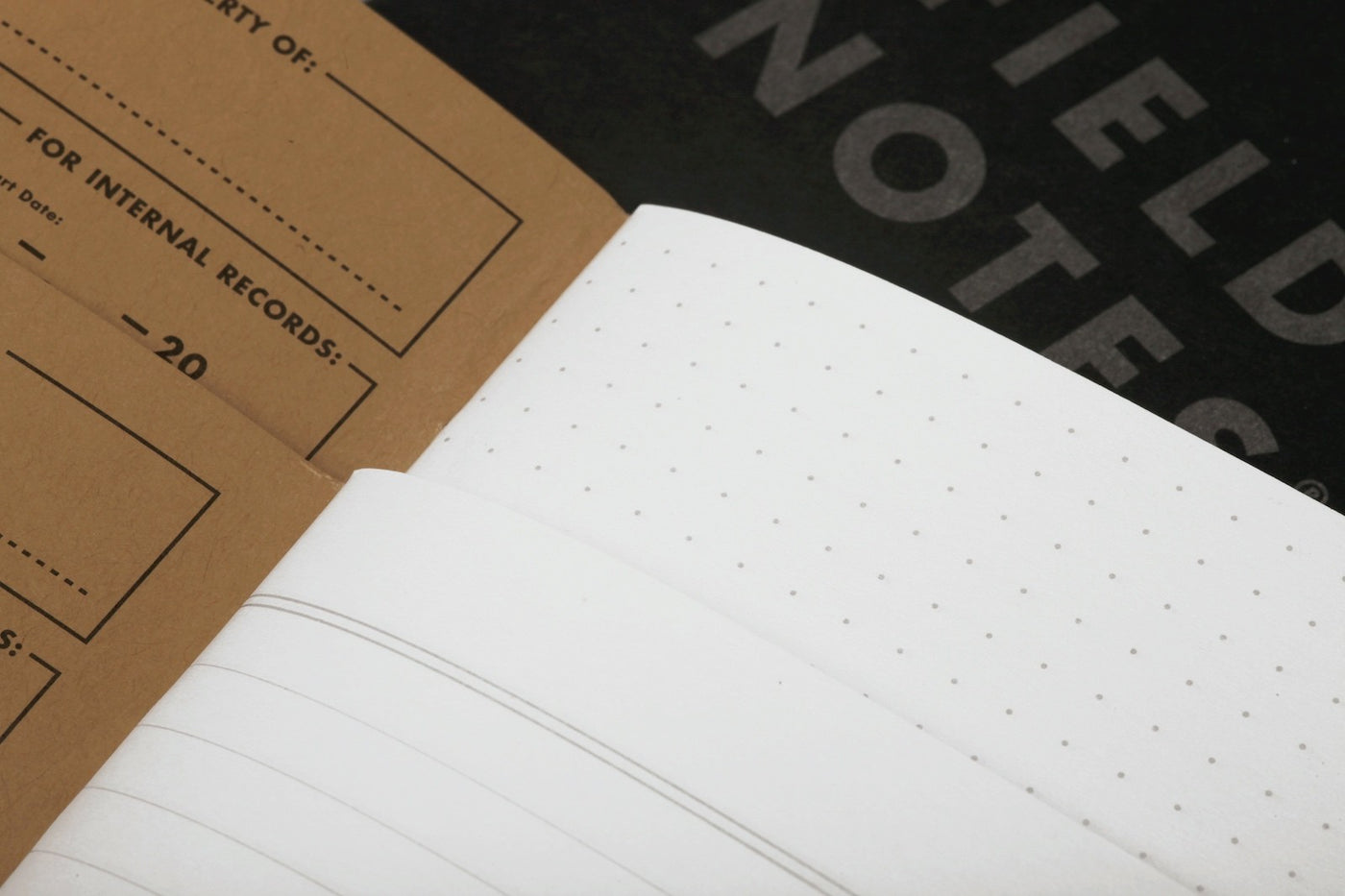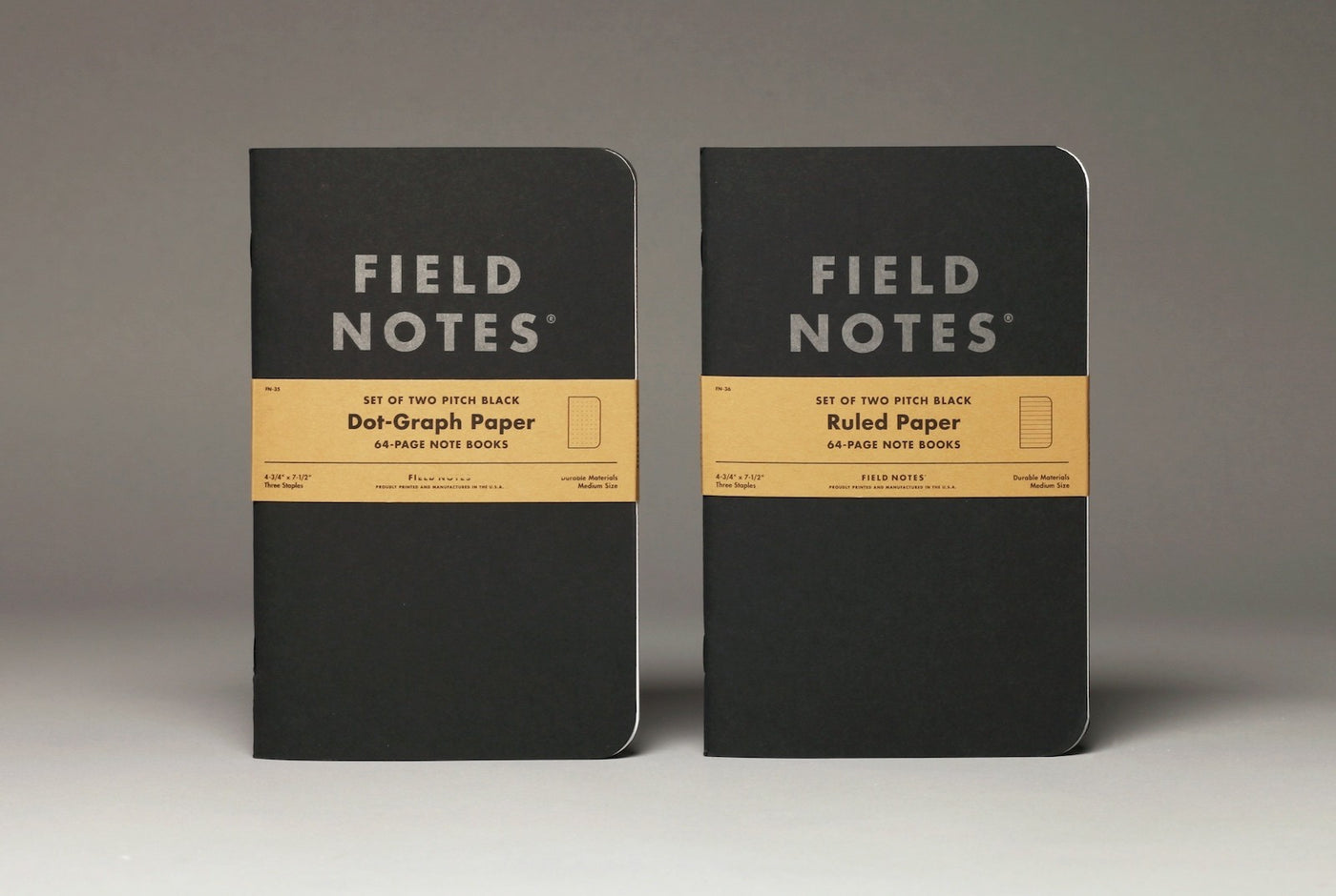 Das Pitch Black Note Book wird in Packungen zu zwei Stück geliefert, mit Dot-Graph oder Ruled 60# Finch Opaque-Papier. Sie sind mit glänzenden schwarzen Heftklammern und robusten 118# Covers mit neuem, Field Notes-exklusivem schwarzem/Kraft-Duplex-Papier gebunden. Sie werden feststellen, dass sie zu jedem Outfit passen.