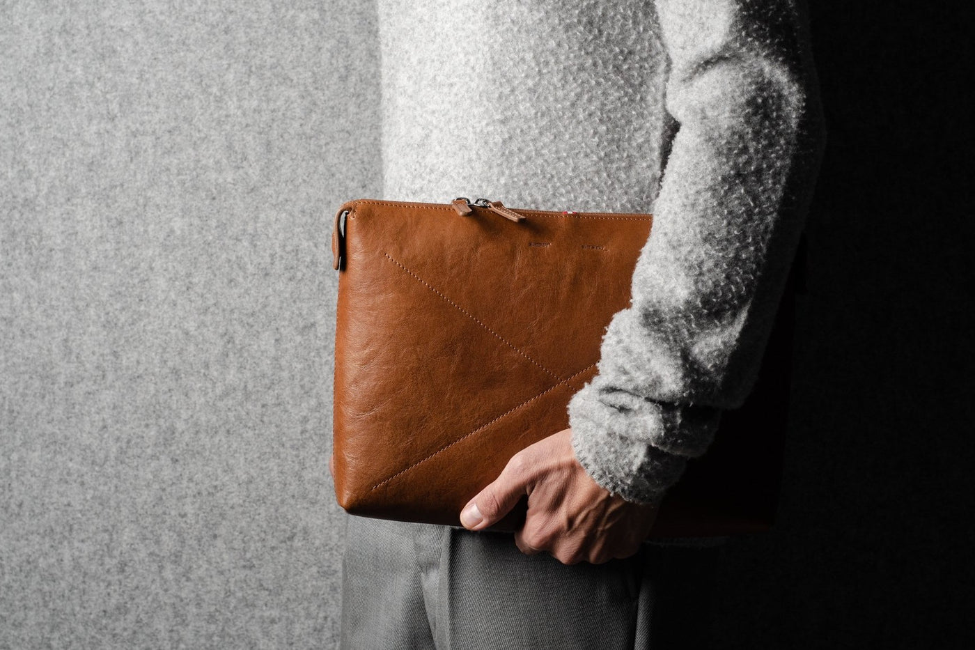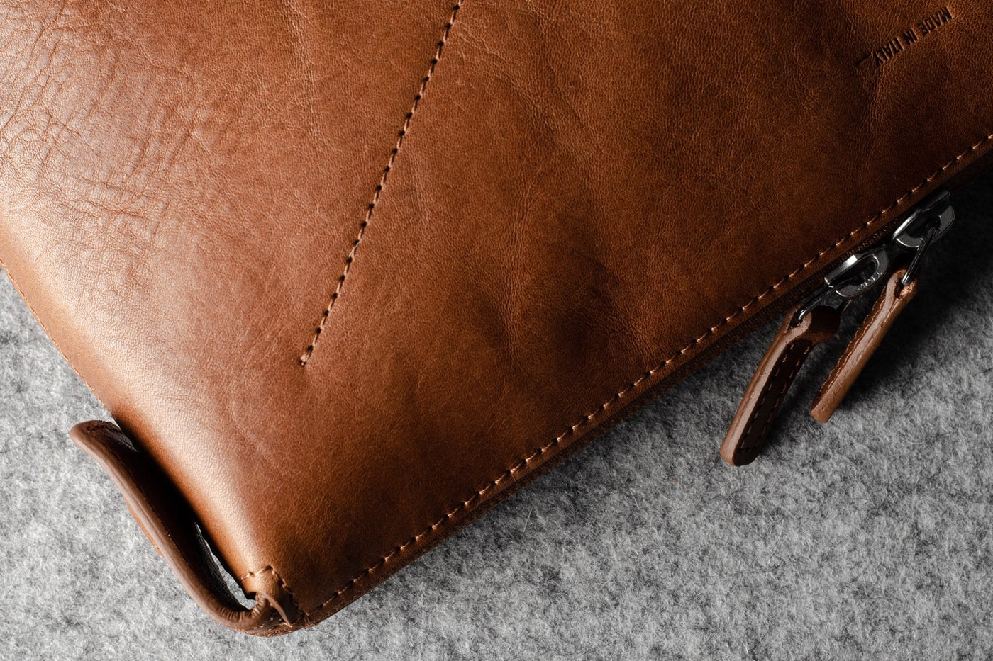This is it. In short: your ultimate MacBook-iPad-iPhone-Notebook-Charger-Magazine-Folio. The Deep MacBook Case is just about the right size to fit everything you need from A to Z. It is made of rich Italian leather and has a unique construction. The folio is softly padded and opens up fully with a scratch-free reverse nylon double zip. Inside you’ll find a wool blend lining with two pockets.
