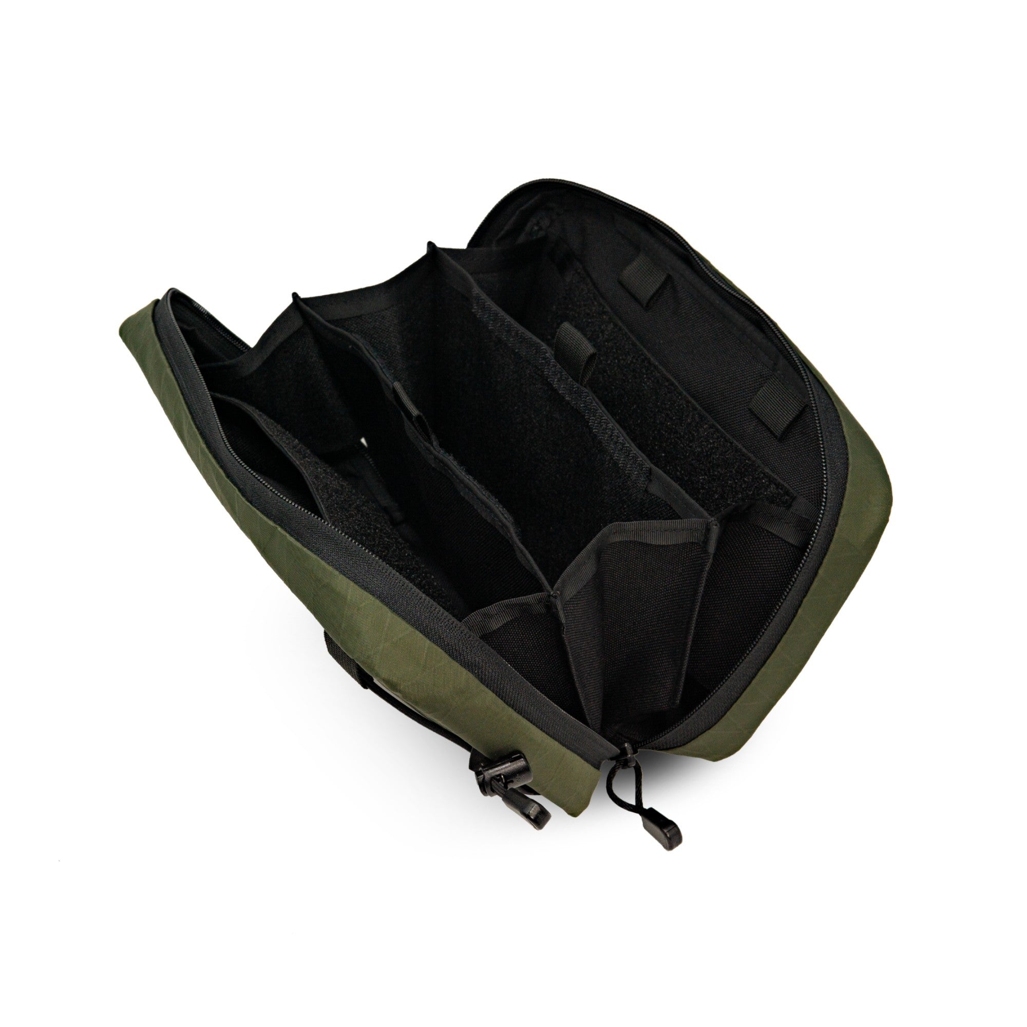 X-Pac® ja 1000D Cordura -materiaalien kestävästä yhdistelmästä valmistettu Pouch M yhdistää kevyen suorituskyvyn ja pitkäikäisen kestävyyden. Kaksisuuntainen vetoketju tarjoaa helpon pääsyn päälokeroon, jossa sisäänrakennettu tray ja irroitettava joustava järjestelijä pitävät tärkeimmät tavarasi siististi järjestyksessä. Etupuolen vetoketjullinen tasku tarjoaa nopean pääsyn usein tarvittaviin esineisiin, ja takaosan säädettävä nyöritys sekä paksu joustonauha lisäävät monipuolisuutta lisävarusteiden kiinnittämiseen.