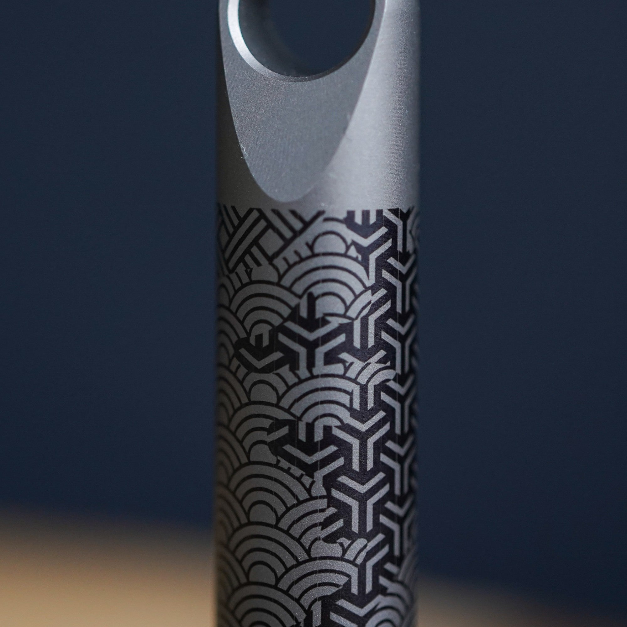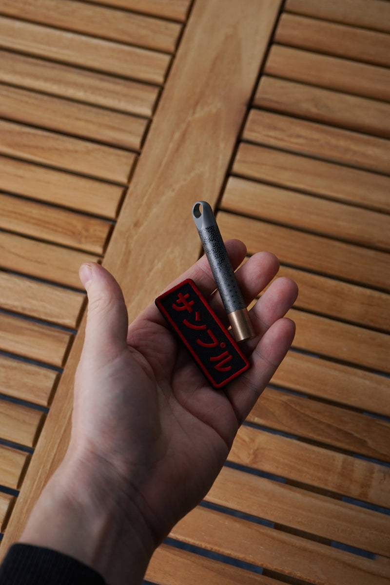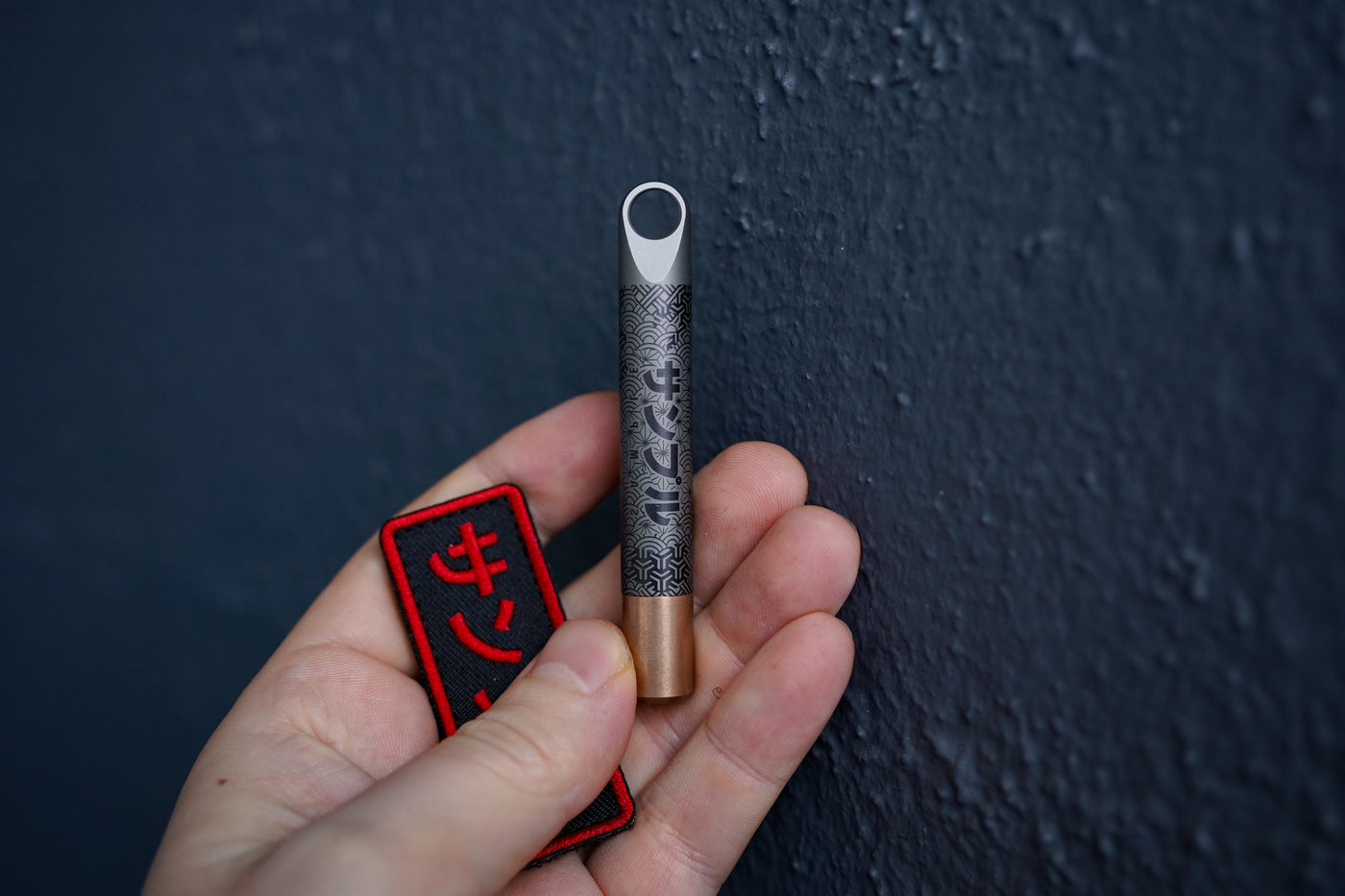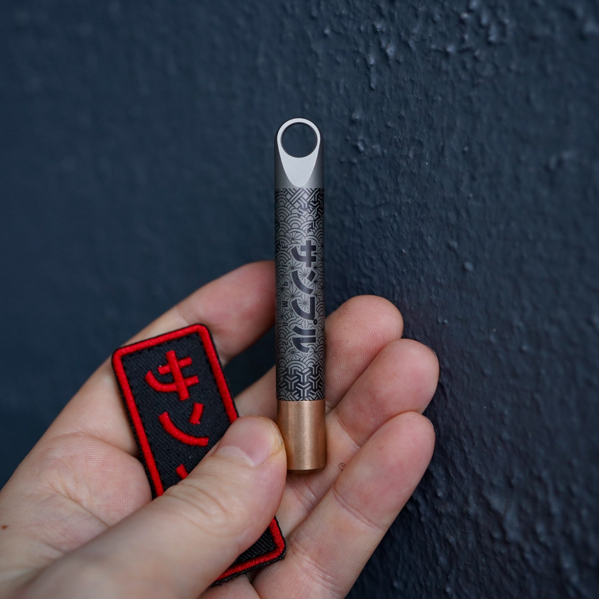 A keychain stash tube made from Grade 5 Titanium and Bronze cap. Made in the USA. Designed and manufactured by Aerocrafted in San Luis Obispo, CA.
