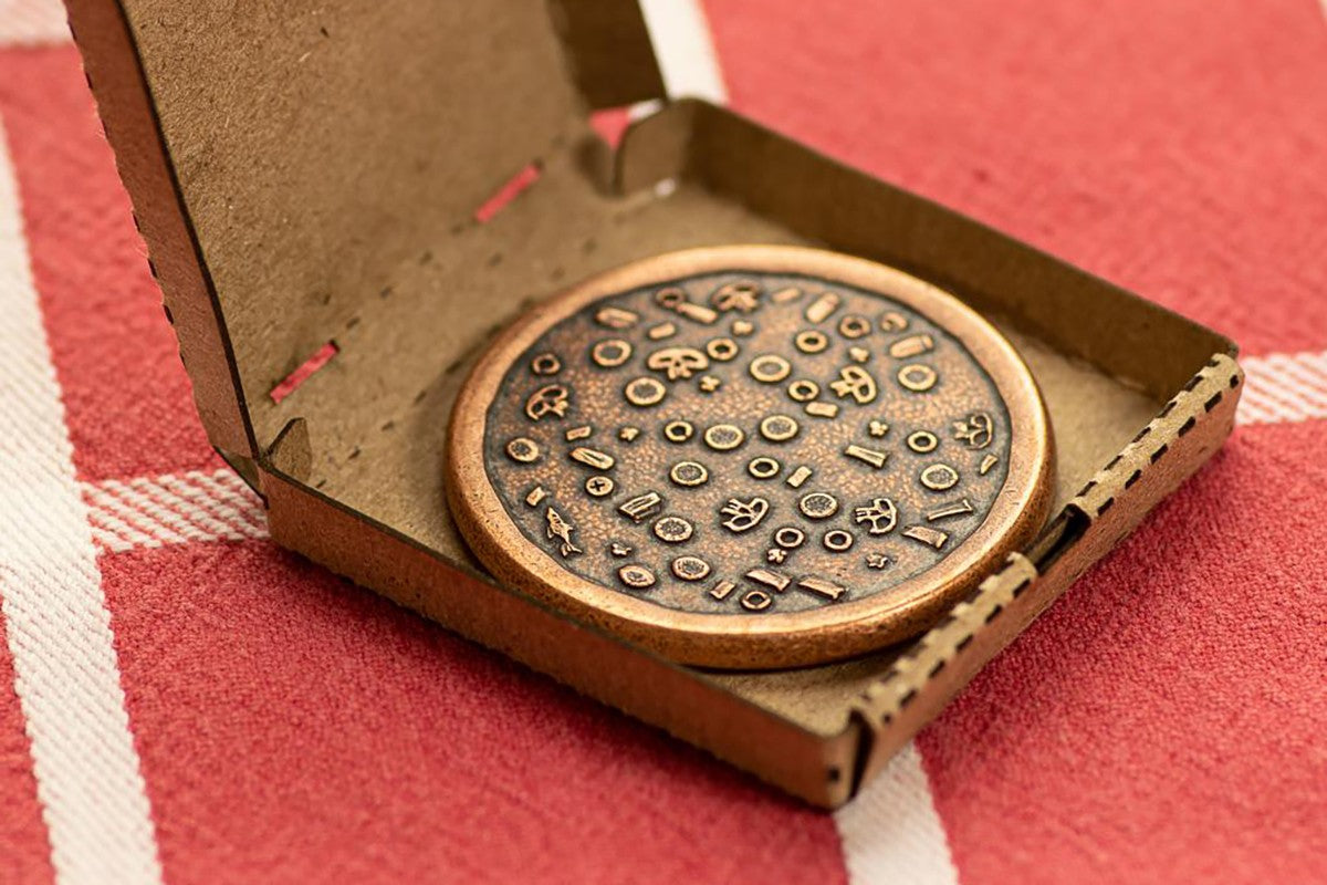 Supreme Pizza Coin is inedible, as hard as solid copper and topped with only the most finely detailed, cold-pressed ingredients delivered straight to your doorstep. Longer than 1-hour delivery guaranteed. The wavy rack lines on the bottom crust are smooth and make for an excellent worry coin surface.
