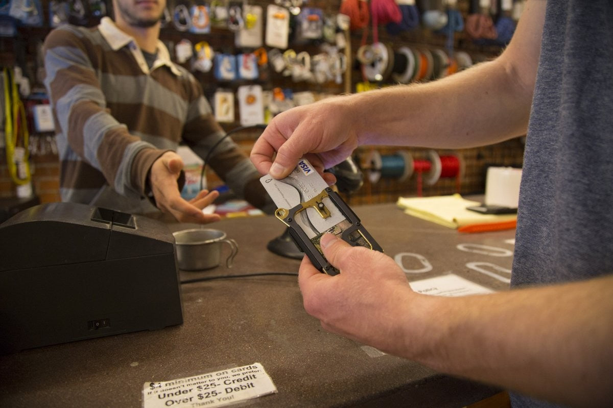 Die Unterplatte des Portemonnaies ist aus CNC-präzisionsgefertigtem Edelstahl, Titan oder Messing. Die Oberplatte ist mit Melonit beschichtet für Langlebigkeit. Jede Platte ist in hochwertiges Horween-Leder eingefasst, das mit der Zeit eine schöne Patina entwickeln wird. Ideal als Portemonnaie für die vordere Hosentasche, sorgt das schlanke Design und das schmale Profil für ein kompaktes und leichtes Tragen im Alltag.