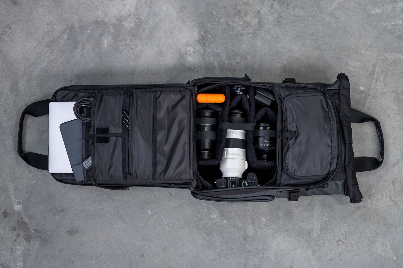 Im Inneren des PRVKE befindet sich die aktualisierte fleecegefütterte Tasche, die an der Klappe des oberen Fachs angebracht ist, und die Öffnungsrichtung wurde umgedreht, sodass sie beim Zugriff auf das obere Fach von innen nicht mehr im Weg ist. Das Laptop-/Tablet-Verschlusssystem wurde ebenfalls überarbeitet, und es gibt drei neue Taschen auf der Laptop-/Tablet-Hülle. Schließlich wurde die Trennklappe, die das Kamera-Fach abdeckte, entfernt, um den schnellen Zugriff auf Ihre Ausrüstung zu erleichtern.