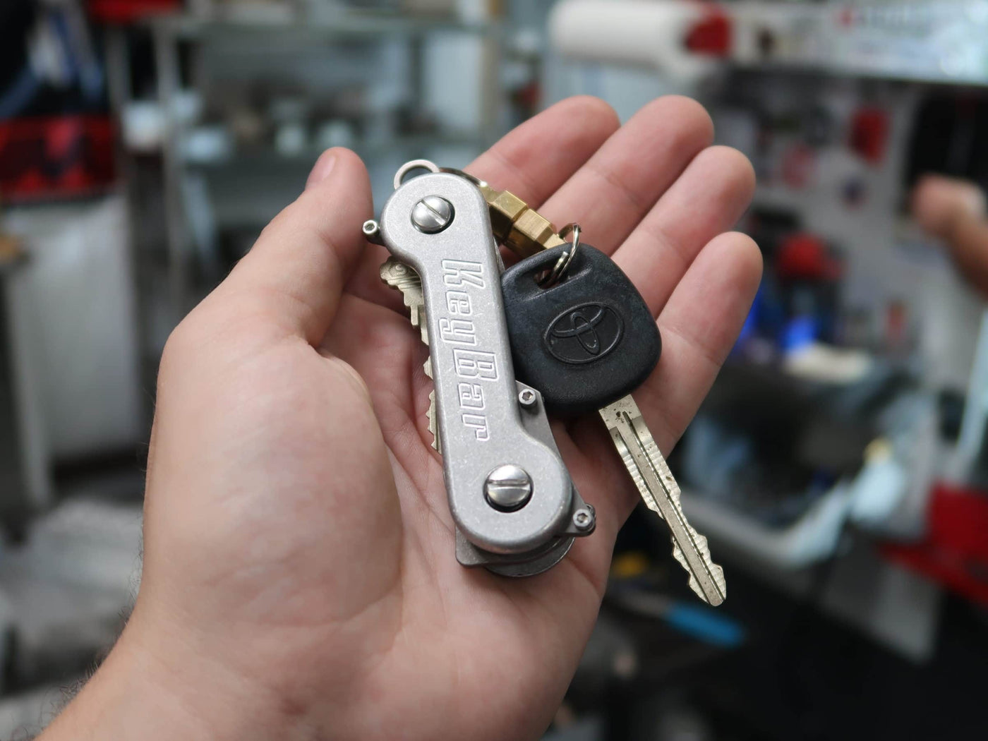 With the included screws, the KeyBar can hold up to 12 keys, and the separately available extension screws increase the capacity even more. To determine if your keys will fit, use this information: Distance between screw holes 65 mm, screw post diameter 4,2 mm. The KeyBar works the best with flat keys. Bulkier items such as a car key can be attached to the included titanium key fob link.