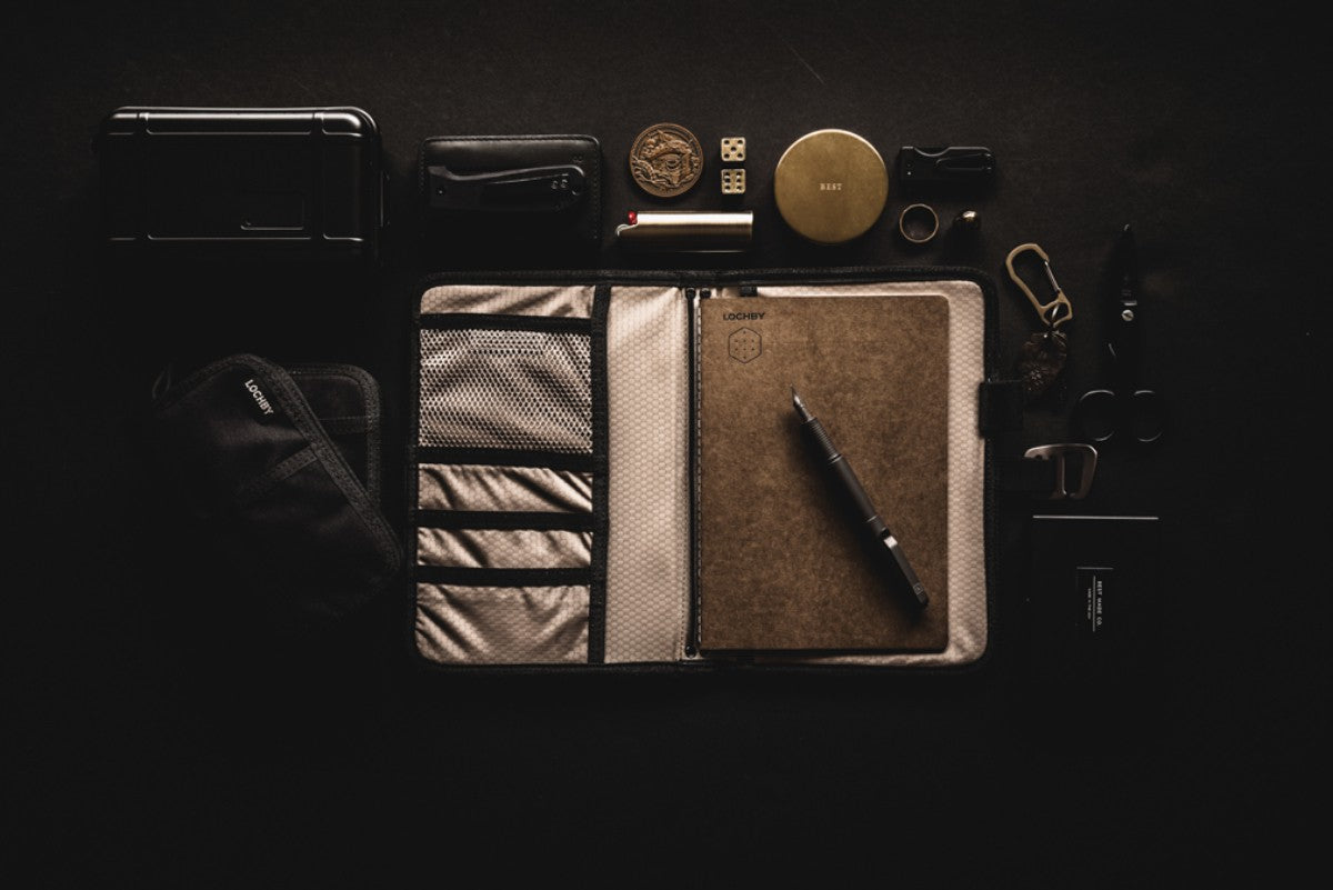 The Field Journal is the perfect case for your notebooks, pens and other small items. It's made from waxed canvas and the aluminum hook locks everything inside. It comes with a Lochby Dot Grid refill included, but accepts all 15 x 21 cm (A5) notebooks, even thicker ones.