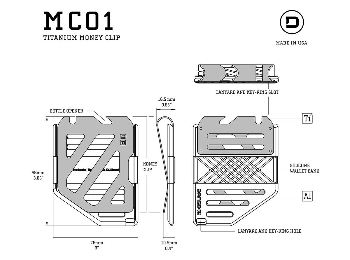 MC01 koostuu kahdesta metalliosasta; titaaniklpsu, pultattuna CNC-koneistettuun 6061-alumiinirunkoon. Silikonihihna pysyy rungon ympärillä tarjoten lisätilaa korteille tai isojen setelien erottamista pienistä.