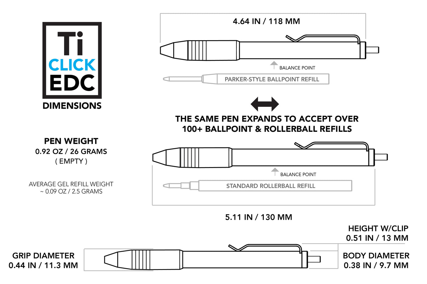 Ti Click EDC -kynä on säädettävä ja siihen sopii yli 100 erilaista mustesäiliötä ilman säätöjä tai virityksiä. Kynä on koneistettu umpititaanista, joka kestää sukupolvelta toiselle. Kaikki kynän osat on koneistettu yksi kerrallaan ilman valmiita osia. Tasapainotettu rakenne ja pitoa parantava oteosa tekevät tästä mainion päivittäin käytettävän kynän.