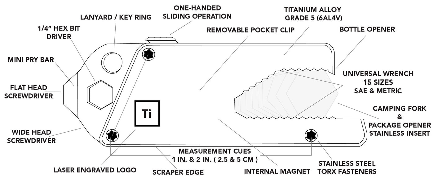 Tämä on uusin versio TPT-taskutyökalusta. Edelliseen malliin verrattuna tämä on 25% vahvempi ja helppokäyttöisempi. Uudet ominaisuudet on lisätty vaarantamatta alkuperäistä designia. Työkalu on valmistettu titaanista ja soveltuu erityisen hyvin pieniin korjaushommiin ilman täysikokoisen monitoimityökalun painoa ja kokoa. Se onkin oiva kapine aina mukana kannettavaksi.