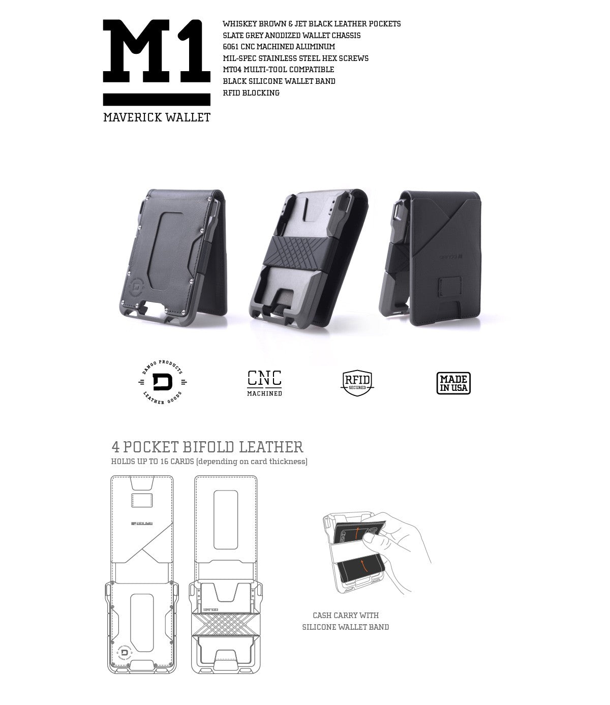 M1 Maverick Bifold -lompakko yhdistää CNC-koneistetun ja anodisoidun 6061 alumiinirungon top-grain -nahkaan, mikä luo hienon yhdistelmän työkalumaisuutta ja eleganssia. Rungossa on läpiviennit joka kulmassa, joilla lompakon voi kiinnittää avaimiin ja lenkkeihin.