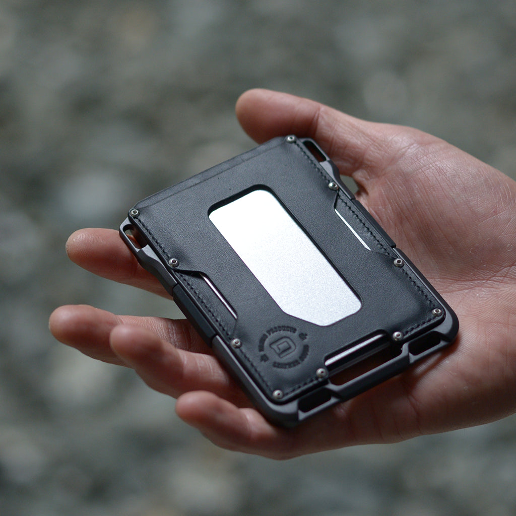 M1 Maverick -lompakko yhdistää CNC-koneistetun ja anodisoidun 6061 alumiinirungon top-grain -nahkaan, mikä luo hienon yhdistelmän työkalumaisuutta ja eleganssia. Rungossa on läpiviennit joka kulmassa, joilla lompakon voi kiinnittää avaimiin ja lenkkeihin.