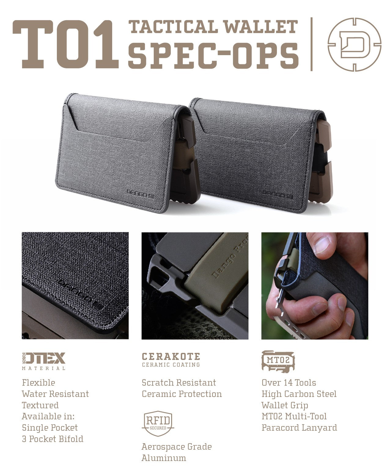 Kuten kaikissa Dango T01 Tactical -lompakoissa, mukana tulee MT02-monitoimityökalu, jossa on yli 14 toimintoa. Työkalu sujahtaa korttipaikkaan ja käytössä ollessaan lukittuu lompakon runkoon.