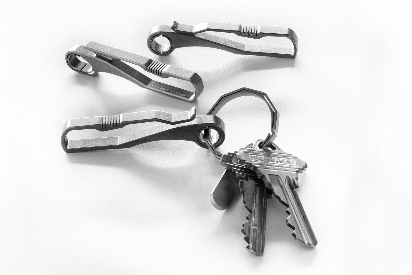 KIN on yksinkertainen avainkoukku jolla saat avaimet kiinni taskuun, vyöhön, vyölenkkin, laukkuun tai melkeinpä mihin tahansa minne haluat avaimet roikkumaan. KIN-sarjassa on Handgreylle tunnusomainen unibody-rakenne tarkkuustyöstetyillä yksityiskohdilla. Jokainen avainkoukku on erikseen leikattu kipinätyöstömenetelmällä Grade 5 / Ti-6Al-4V -titaanista. Menetelmä on tarkin ja yksityiskohtaisin saatavilla oleva valmistustapa - sen on myös kallis, joten yleensä sitä käytetään vain prototyyppien ja tarkkuustyökalujen työstöön.