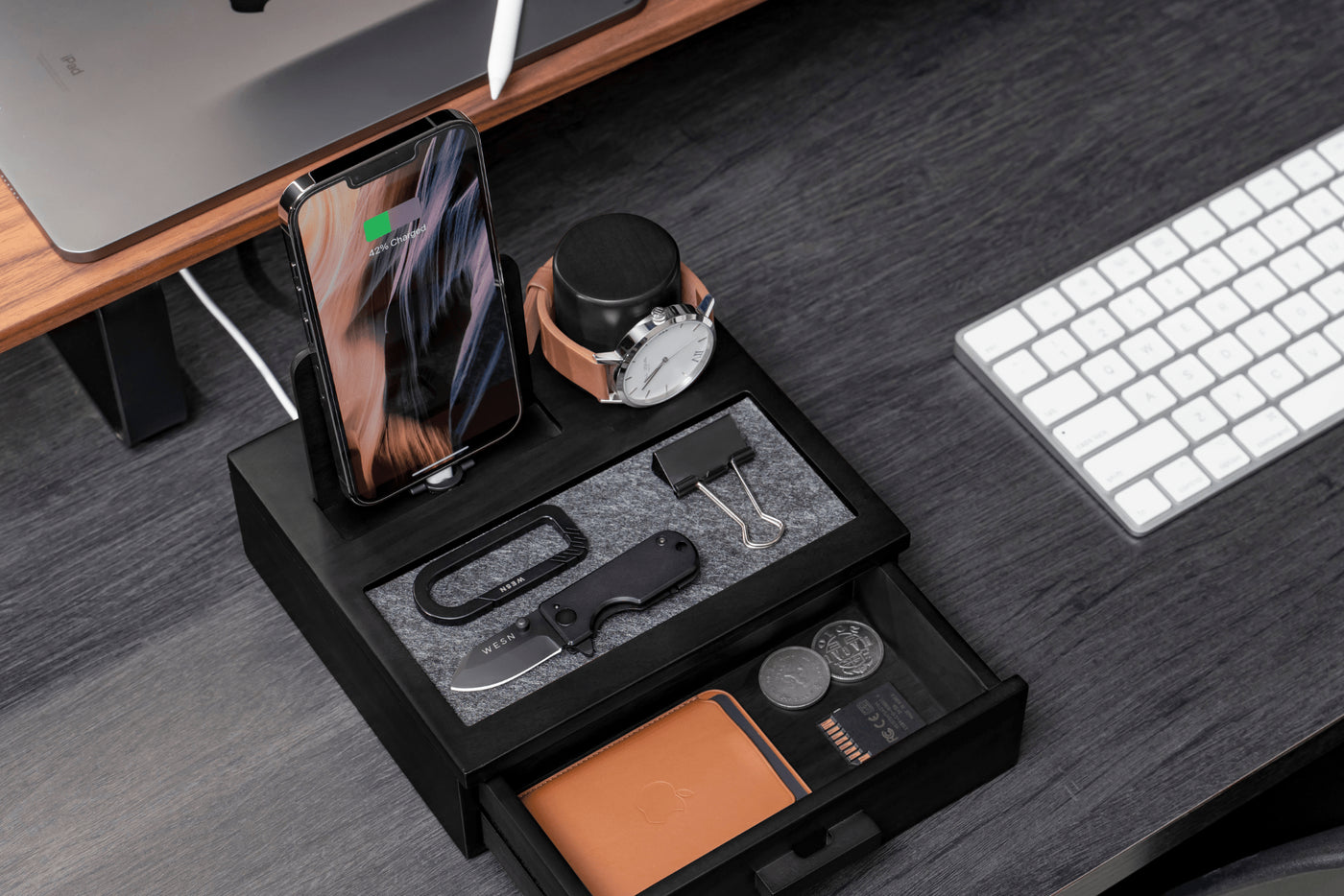 Sidekick yhdistää H&H -tuotesuunnittelun tunnusmerkit. Minimalistinen design ja toimiva telakointiasema, jossa tarvikkeet viihtyvät. Saat pidettyä siinä kaikki tärkeimmät, aina latingissa ja valmiina lähtöön.