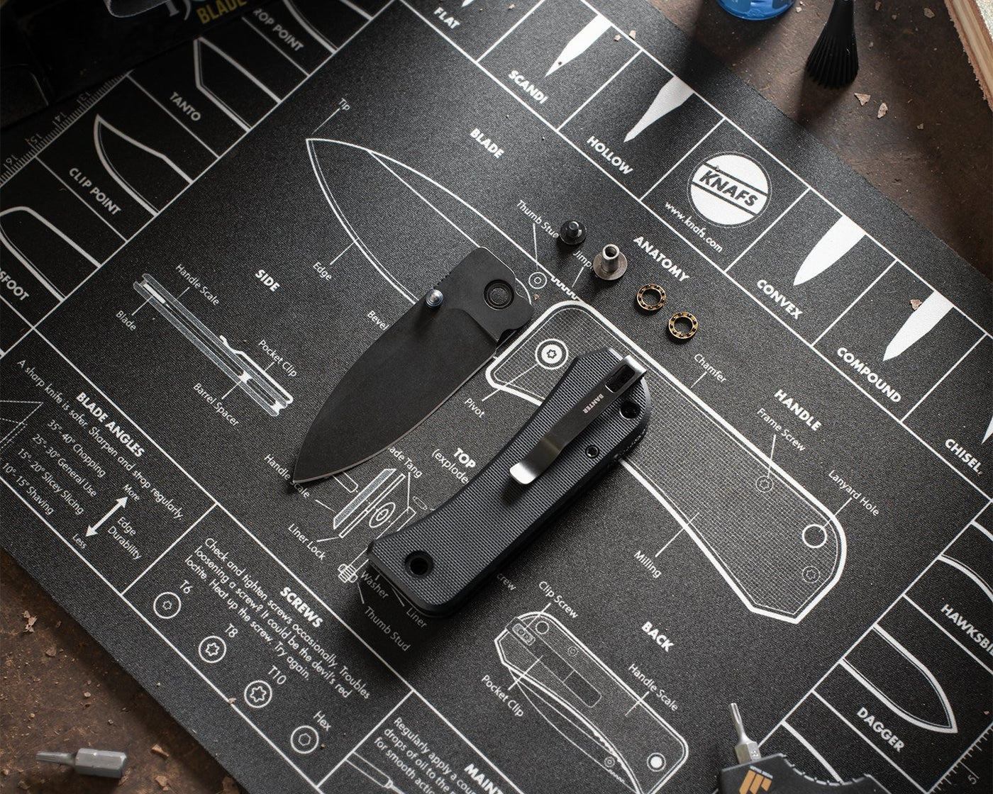 Matosta löytyy taskuveitsen kuva keskeltä ja käteviä referenssejä taittoveitsen anatomiaan liittyen: nivel, lukitusmekanismi, prikat yms. Sivuilla on erityyppisiä terän muotoja ja yleisiä profiileja. Kolme osiota täynnä informaatio veitsien perusasioiden oppimiseen kuten terän kulmat, yleiset ruuvityypit ja huoltovinkit. Maton on suunnitellut Ben Petersen ja toimii nopeana veitsireferenssinä aloittelijoista fanaatikoihin.
