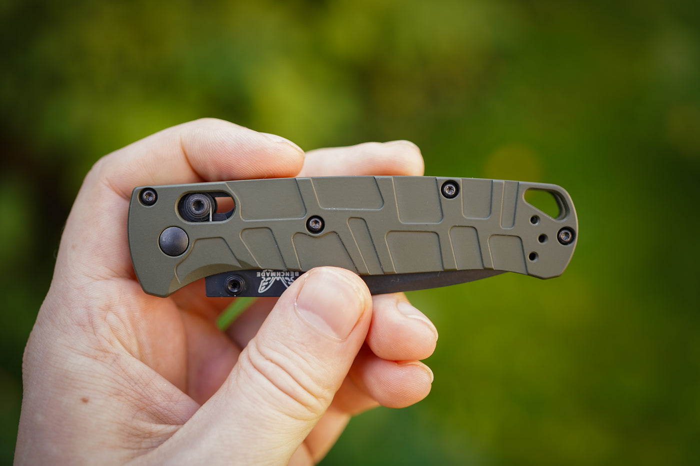 Korkealaatuisesta titaanista valmistetut Cerakote-viimeistellyt kahvat Benchmade Bugout -veitselle.
