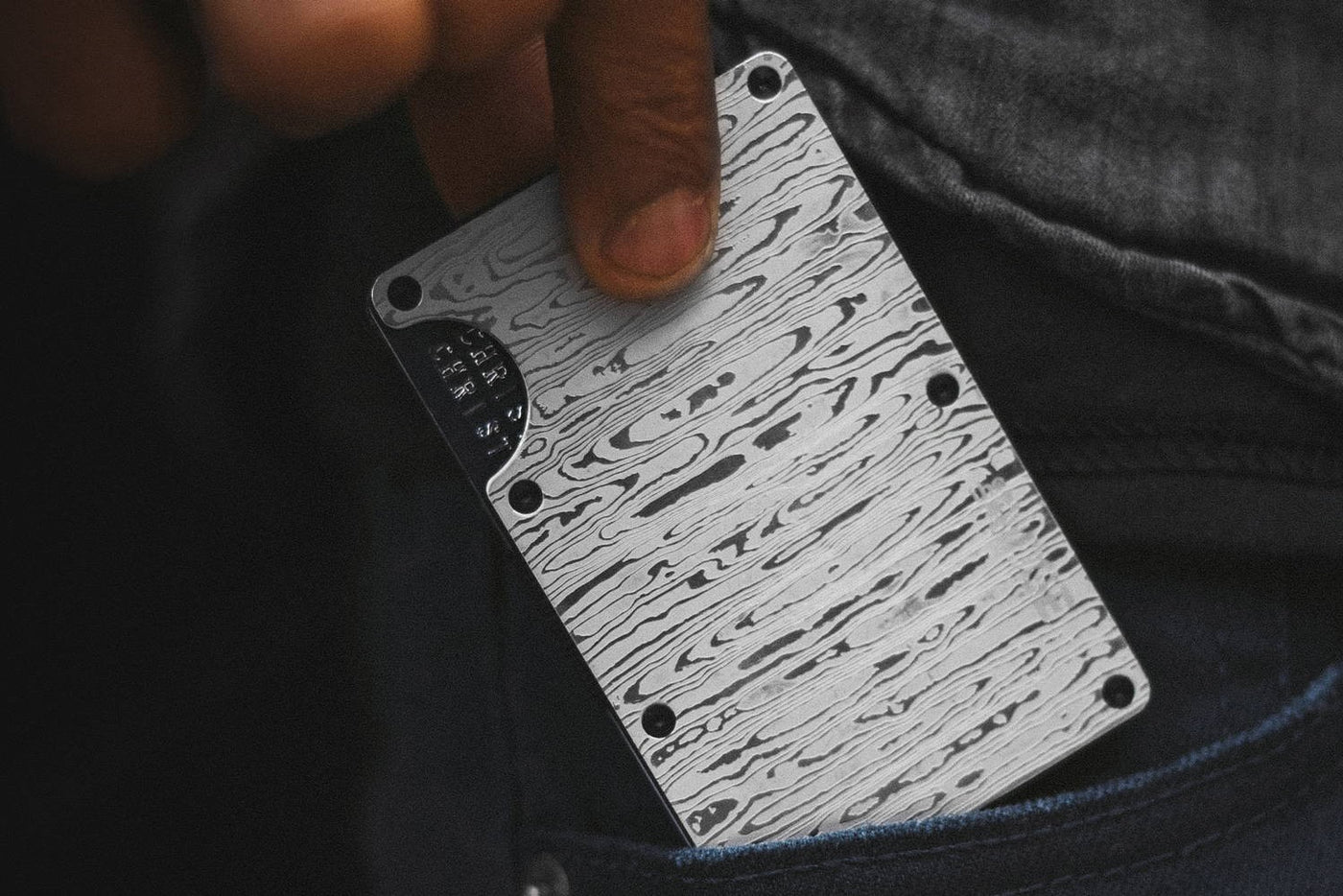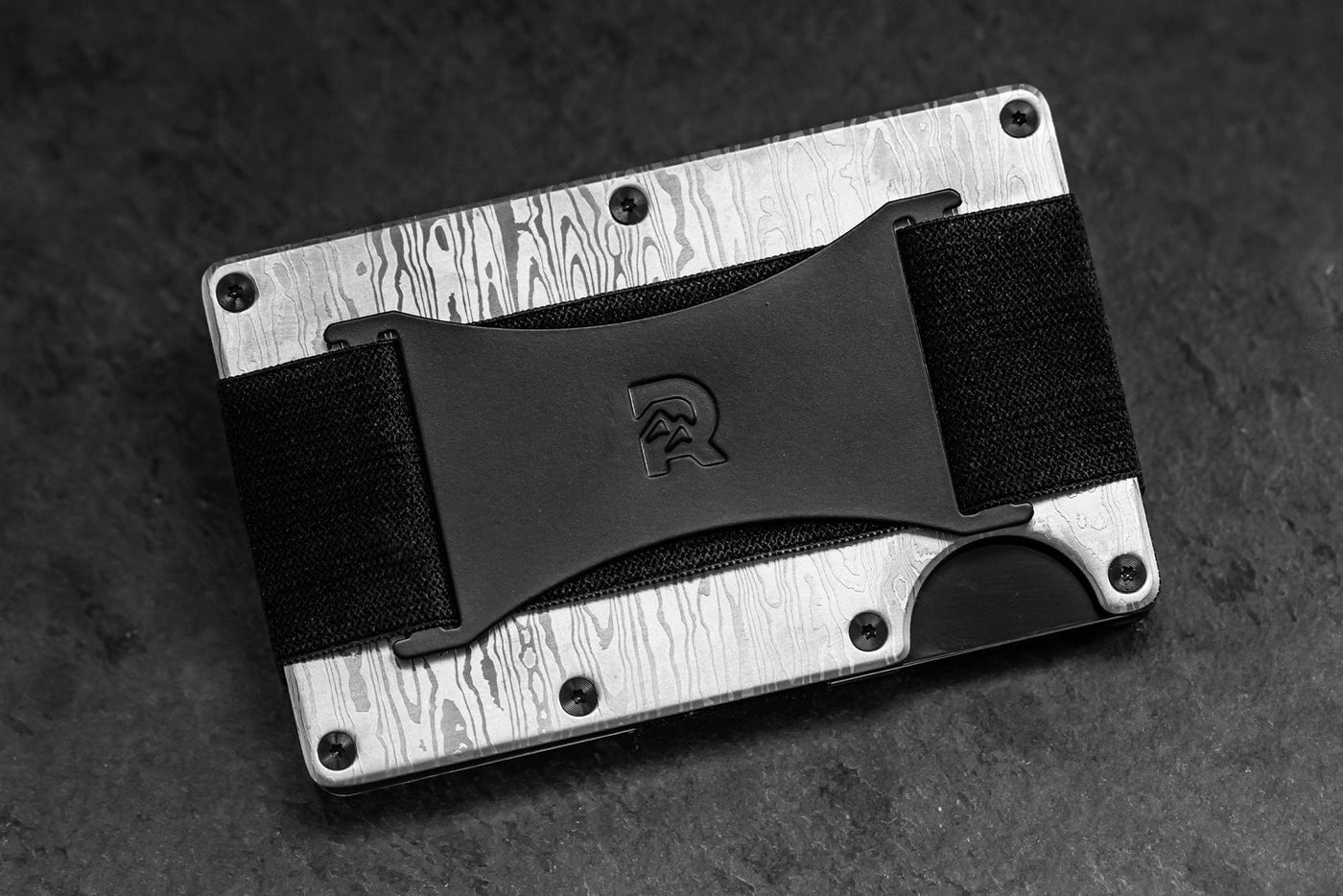 Tämän lompakon laserkaiverrettu kuviointi on saanut inspiraationsa Damascus-teräksestä, jota käytetään paljon esimerkiksi terien taontamenetelmissä. Ruostumaton teräs ja vahvistettu hihna kestävät pitkään ja päälle tulee Ridge-tuotteiden tapaan elinikäinen takuu.