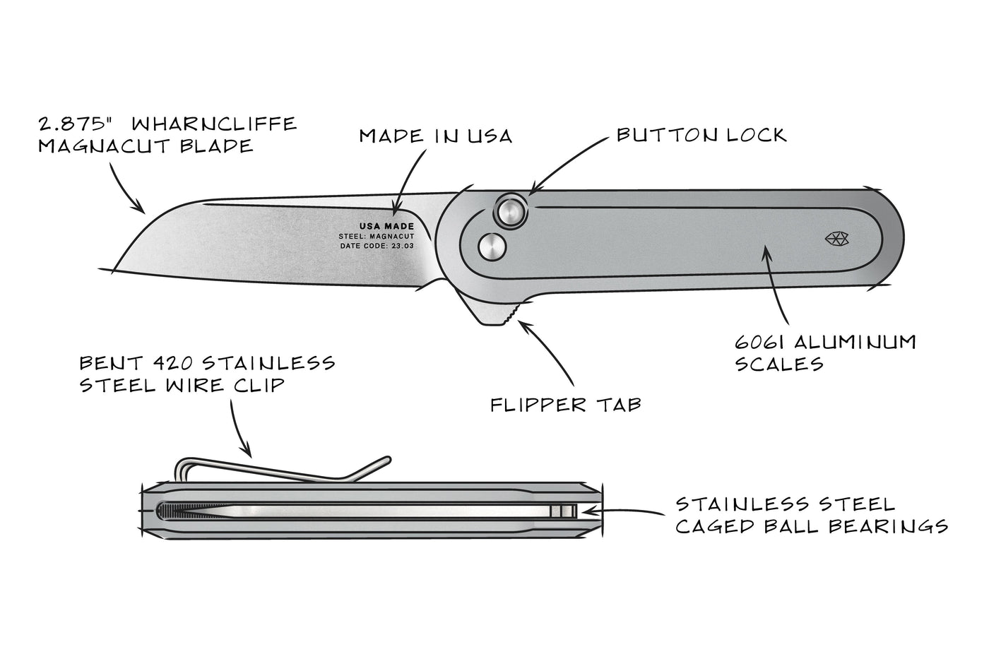 Wells on TJB:n ensimmäinen flipperimallinen veitsi, jossa yhdistyy muotoilu ja toiminnallisuus. Suunniteltu ja valmistettu Yhdysvalloissa MagnaCut-terällä. Painikelukitus on suoraviivainen ja helppo käyttää yhdellä kädellä, ja painikkeen sijainti pitää sormesi poissa terän liikeradalta.