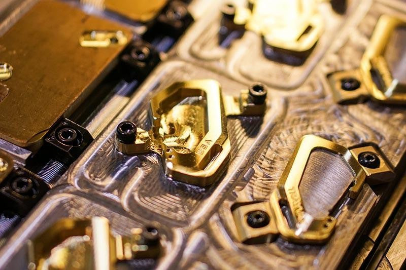 Nämä karabiinerit on CNC-koneistettu Trayvaxin pajalla kiinteästä messingistä. Itse asiassa ne tulevat täysin samoista paloista, joita käytetään Contour-lompakon rungon valmistamiseen. Lähempää katsoessasi näet yksityiskohtia valmistusprosessin tarkkuudesta.
