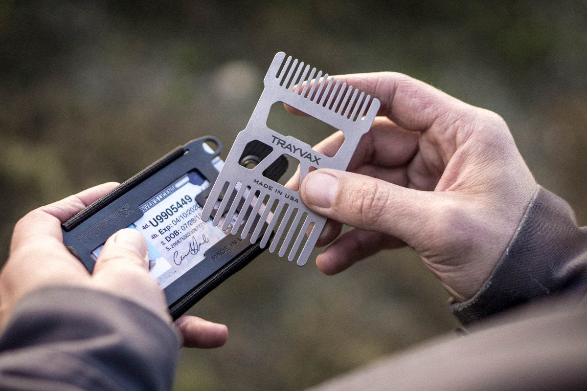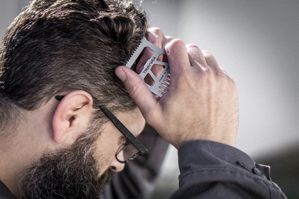 Shift-kampa on suunniteltu mahtumaan lompakkoon, jolloin lookkisi pysyy skarppina joka tilanteessa. Leveä hammastus on tarkoitettu pidemmille hiuksille ja parralle, ja toisessa päässä oleva tiheä hammastus hiusten muotoiluun. Kiillotettu viimeistely ja pyöristetyt hampaat tuntuvat mukavilta ja kampa liukuu nätisti hiusten lomitse. Lujatekoinen ruostumaton teräsrunko tarjoaa samalla lompakkoosi RFID-suojauksen. Viimeisenä, muttei vähäisimpänä, kammasta löytyy myös pullonavaaja.