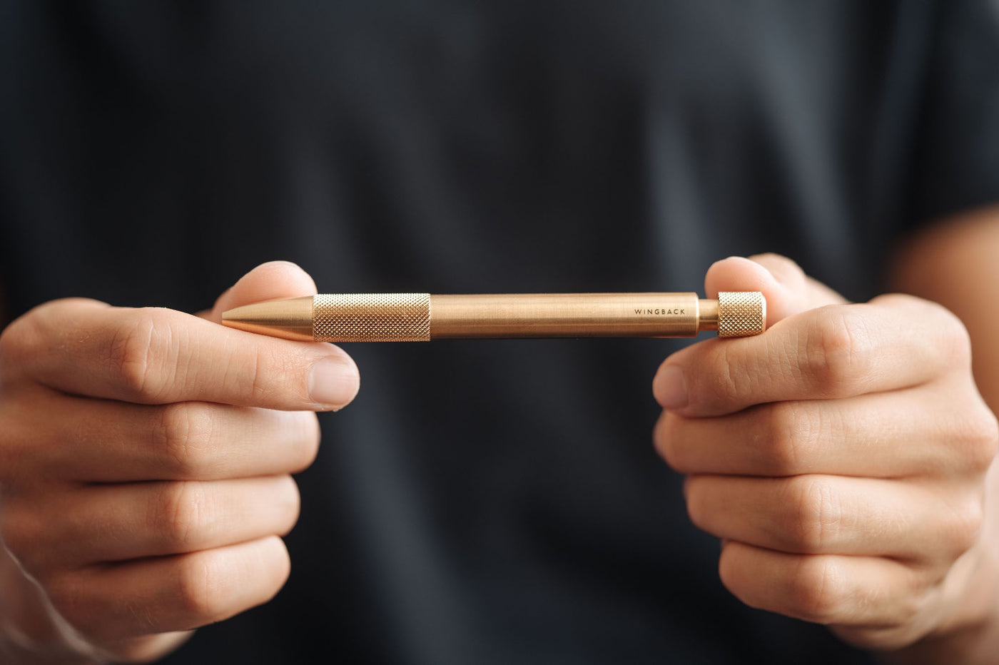 Noudattaen "osta kerran" filosofiaa, Wingback Mechanical Pen Brass -kynä on suunniteltu kestämään vuosikymmeniä. Tämän kiinteästä messingistä koneistetun kynän tuntuma on vakuuttava ja paksuus on sopiva vähentämään kirjoitusta syntyvää rasitusta. Tasaisesti toimiva yhden käden kiertomekanismi lukitsee kärjen paikoilleen. Jokaisen kynän mukana tulee paineistettu Fisher Space Pen PR4 -mustesäiliö.