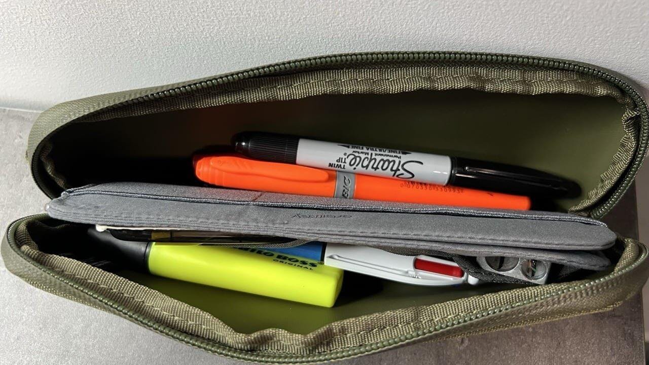 A good basic kit to organize your pencils, but not only with its 3 small internal pockets, 2 elastics. Can be used for an EDC organization. Don't stand empty straight on a table, you have to manipulate it a little to make it hold. Good value for money otherwise.