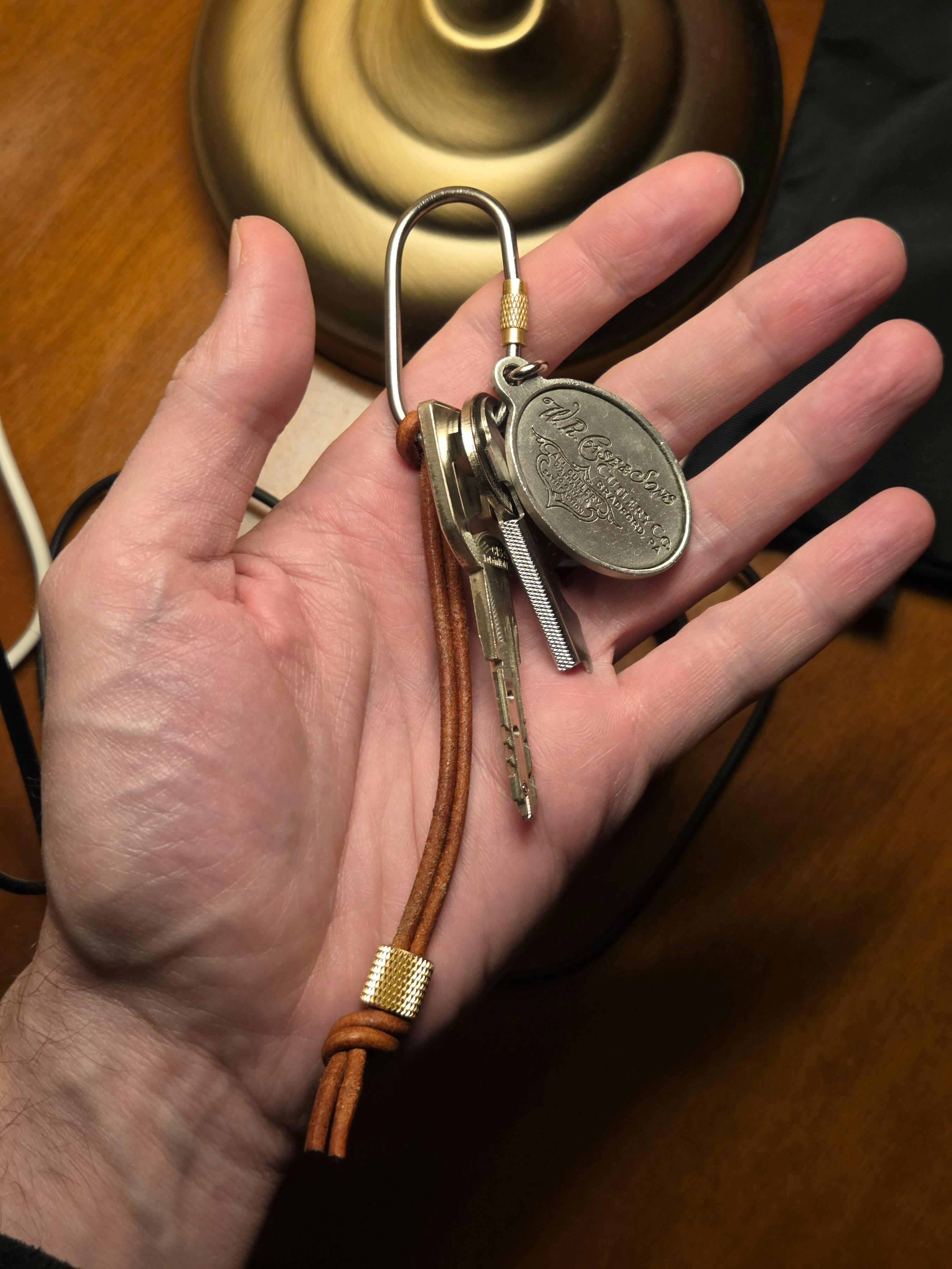I hate carrying bags or backpacks, so I always keep everything in my pockets. That’s why I was looking for the smallest wallet possible to hold my driving license, cards, some cash, and safely store my apartment key without scratching my car key fob. This wallet is perfect! I love its design, small size, and functionality. It easily holds five cards, some cash, and two keys. If you use only one key, it’s fully covered by the leather sleeve. I absolutely love it!