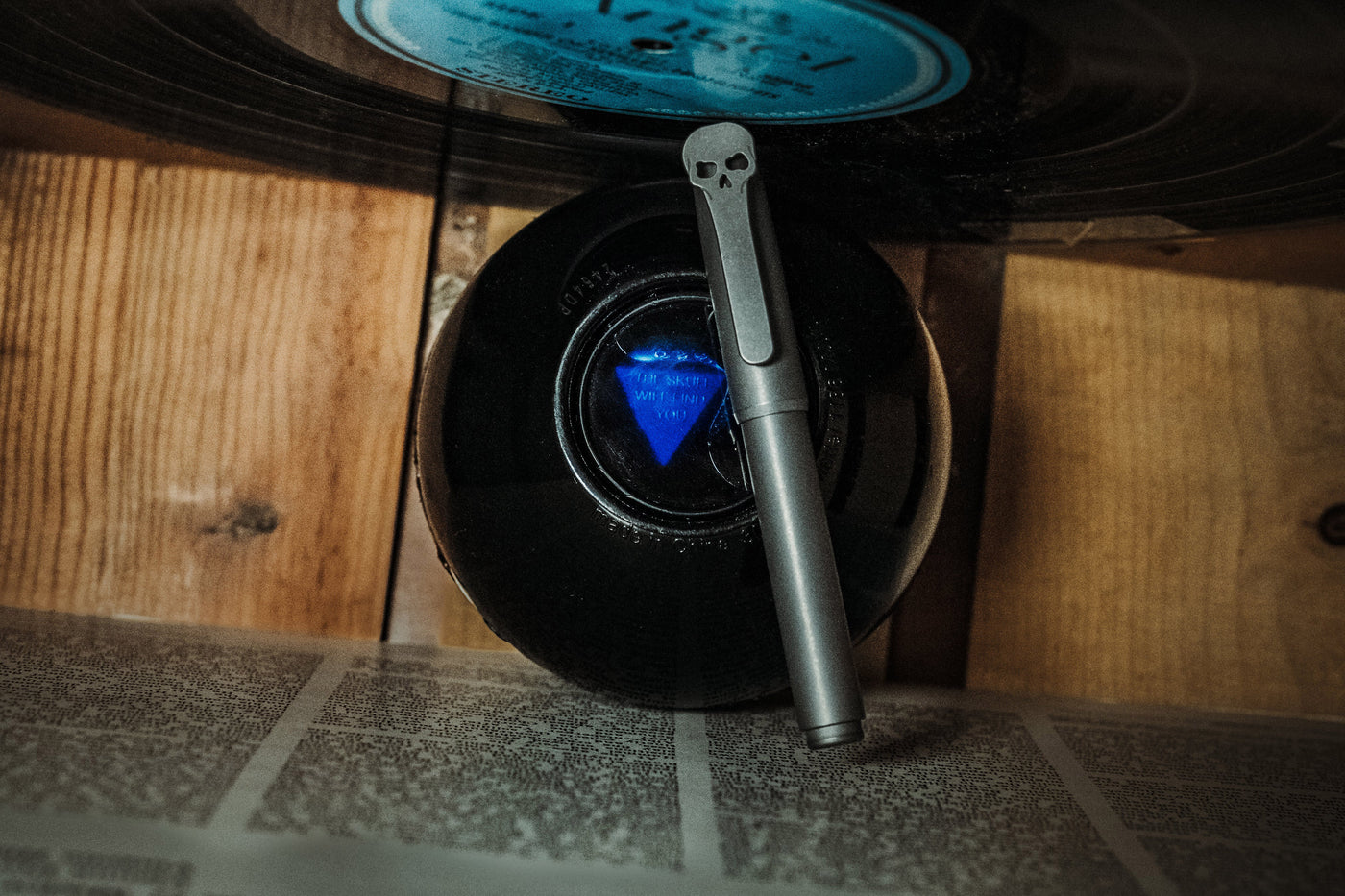 If you are into knives, you can spot his iconic skull pocket clip from across the room. Bid Idea Design timeless design languages feel like a good match. This grade 5 titanium pen is comfortable, pocket-friendly, and writes extremely well thanks to the premium, blacked out, German made Bock 180 Extra Fine nib.