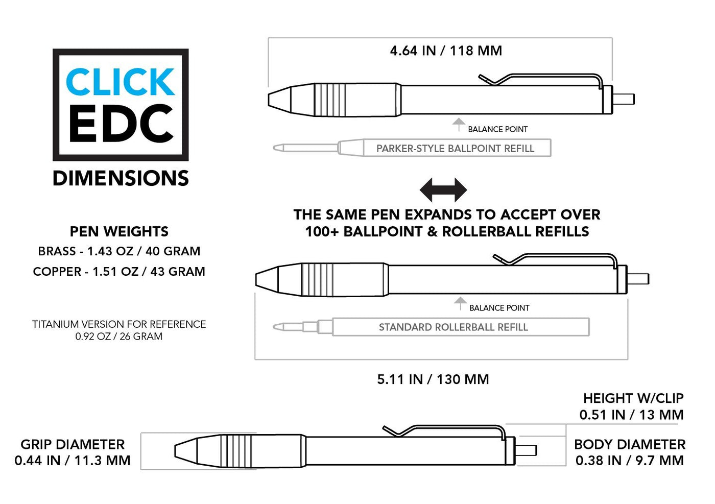 The Click EDC pen is adjustable and accepts over 100 different refills without hacks or modifications. No off-the-shelf parts, everything is machined one part at a time. The balanced design and anti-slip grip makes this a great pen for everyday use.