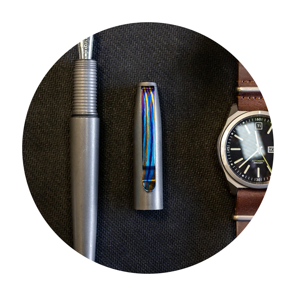 These titanium damascus pen clips are perfect for making your Big Idea Design pen uniquely yours. Every clip is polished and torched by hand, every piece has it's unique pattern and colors. Please note that the clip will be picked up randomly to each order, we don't offer a way to see them all and choose the preferred one.