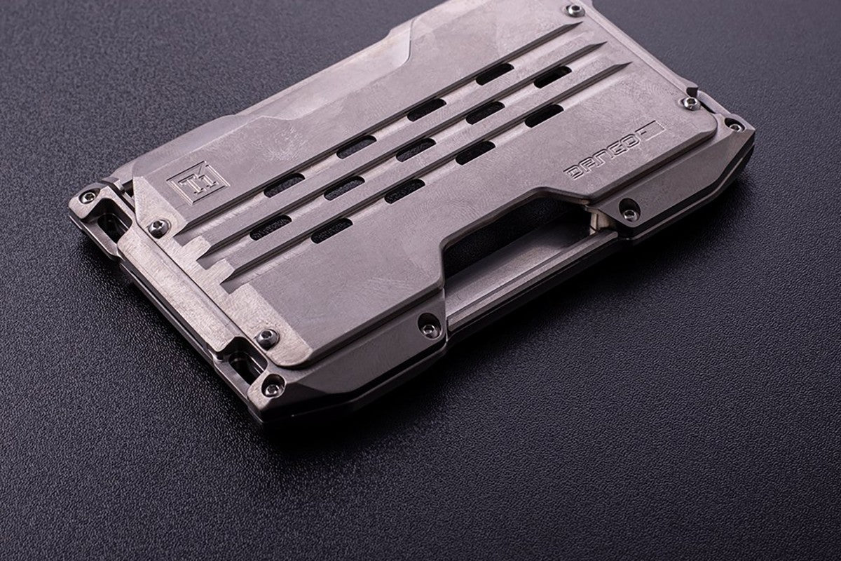 The A10 Adapt Titanium wallet is made of CNC machined Grade 2 Titanium, carefully hand finished and hand assembled in the USA. It is equipped with Dango’s popular and unique patent pending quick release rail mechanism on both sides of the wallet that allows easy access to cards while keeping them securely in place. On one side of the chassis is a horizontal cavity holding up to 4 cards that is protected by a removable titanium RFID plate. On the other side is a single card, vertical oriented cavity meant for displaying identification, badges and any cards that needs scanning; perfect for accessing secured buildings and boarding public transportation.