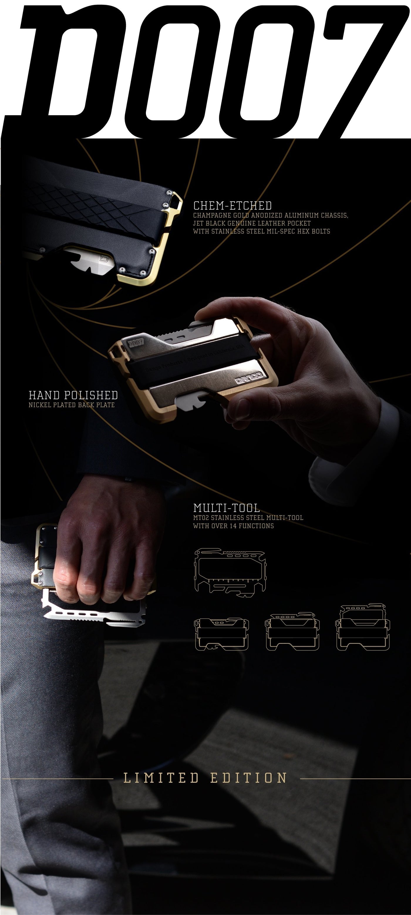 The D007 is machined out of 6061 aluminum and the gold anodized chassis has a velvet-like finish. The hand polished nickel plated backplate creates a contrast between ultra-matte and high-gloss. The combination of top grain leather, premium metals and precision craftsmanship defines the looks of D007 wallet. Limited to 2000 pieces.