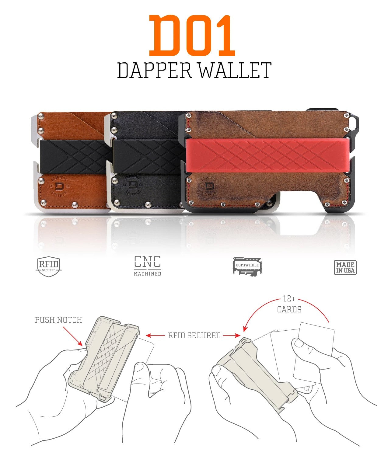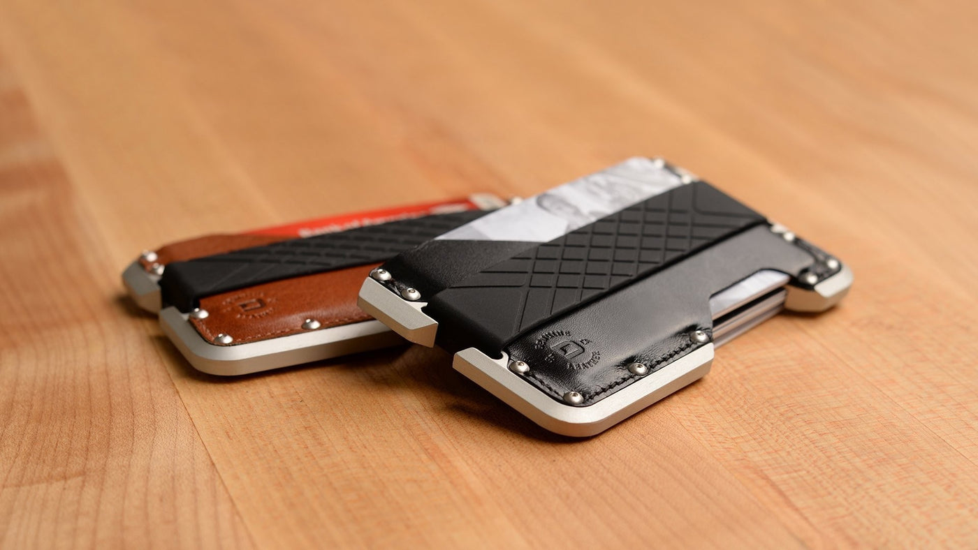 The clean lines and quality materials of the D01 Dapper Wallet fit from the boardroom to night out on the town. The top grain leather is secured to aluminum chassis with mil-spec bolts, keeping the slim profile at all times. The wallet is designed to hold up to 12 cards and RFID-blocking protects them from unautohrized scanning. Handcrafted and made in USA.