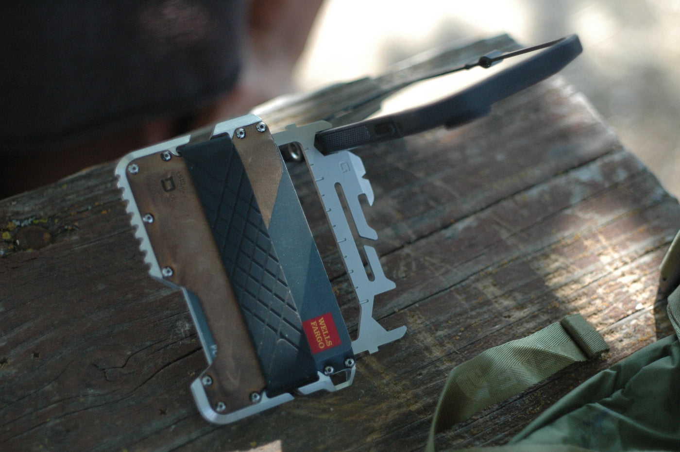 The first row of engagement reveals a serrated and sharpened edge. Engage to the second row and you can fit your fingers into the multi-tool and grip the wallet as a handle for more leverage. If more space is required, the multi-tool can be engaged to the leading edge of the wallet frame. To use the multi-tool's other functions, simply flip it around. To stow it again, the flat side of the multi-tool is faced on the backside of the wallet with the thumb tab pointed up.