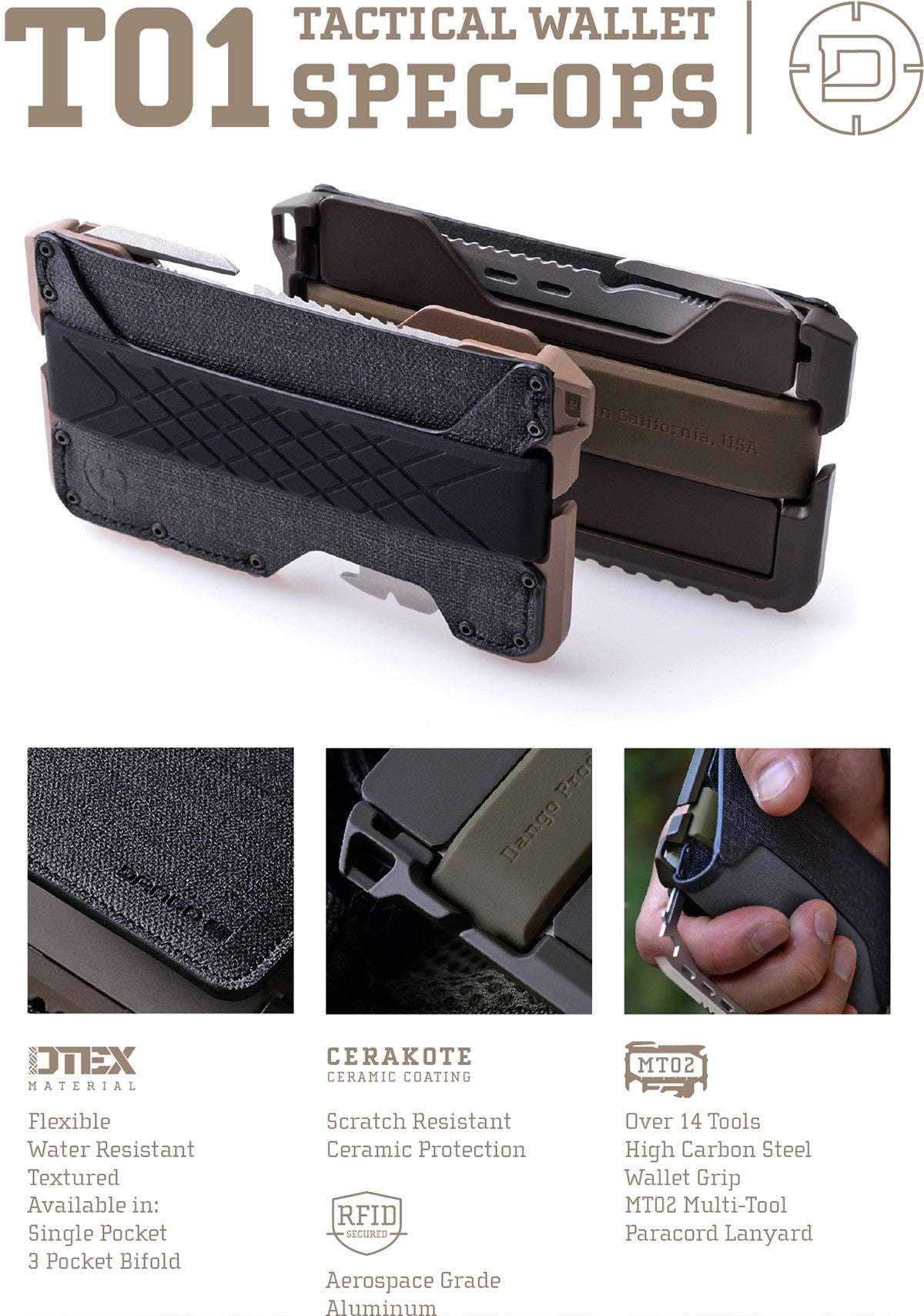 The T01 Tactical Wallet Spec-Ops Gunmetal edition is built to be rugged yet sophisticated. It has a fine mixture of metal and soft goods to hold your everyday essentials. The DTEX exterior is a resilient, flexible, water resistant, textured and durable material designed to withstand rough usage.