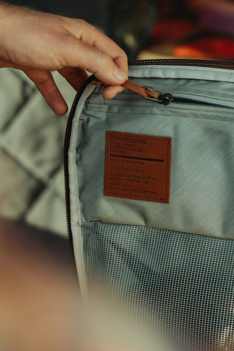 Civic Travel Bag series is acclaimed for offering a swath of travel-forward features: luggage pass-through, water bottle pockets, and 13+ organizational zones. Evergoods took its modern DNA and infused it with a custom-made, high-end cotton & wax-finished shell called P400 Wax C4X.
