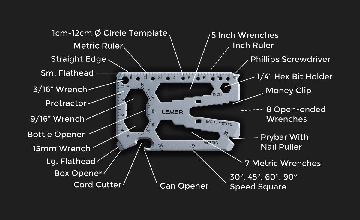 The Toolcard Pro lets you solve problems at a moment’s notice - open boxes, tighten a loose screw or bolt, cut cords, and pop open a friend’s beer. It packs 40 tools into a 1,5 mm thin card tool, slipping easily into your wallet. Beautiful satin finish in silver or black.