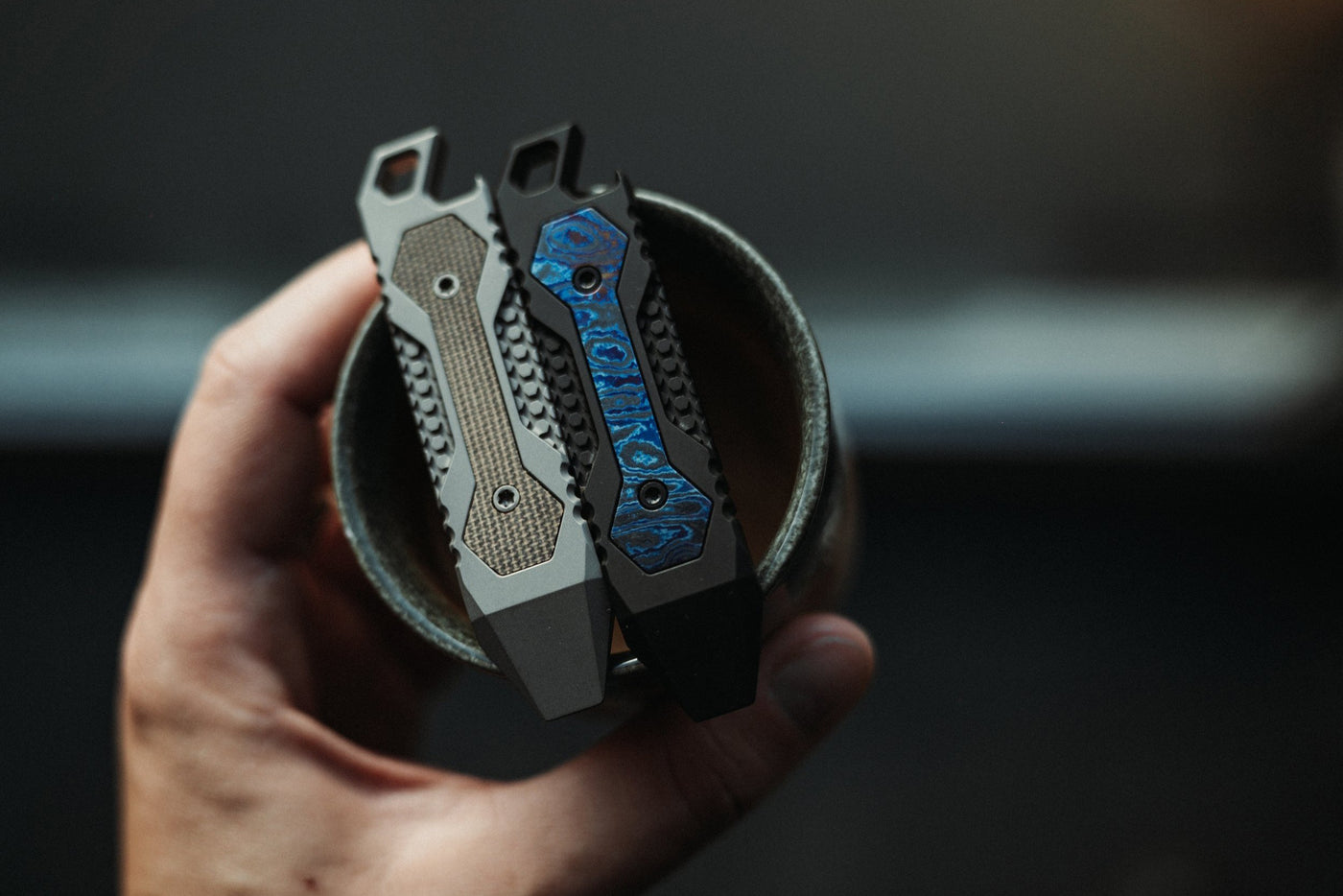 The HexBar is a tool that will perform the two most important functions - prybar and bottle opener. The harmonic and geometric appearance was achieved through the use of a hexagon figure, hence the name HexBar. The side parts are partially filled with a hexagonal pattern to ensure better grip on the hand. This is a great looking piece of titanium that can hold up a lot and provide usability when you need it. Micarta and Zirconium Timascus Inlays are replaceable.
