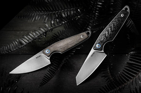 Makro 1, design by Jesper Voxnaes, is a big brother of the Mikro 2. A fixed blade compact in size, but big in performance. Bohler M390 stainless steel blade with stonewashed finishing drop point profile. Micarta handle, stainless steel screws with blue anodized titanium ring. Comes with a pocket leather sheath that has a magnetic clip for carrying in the pocket.