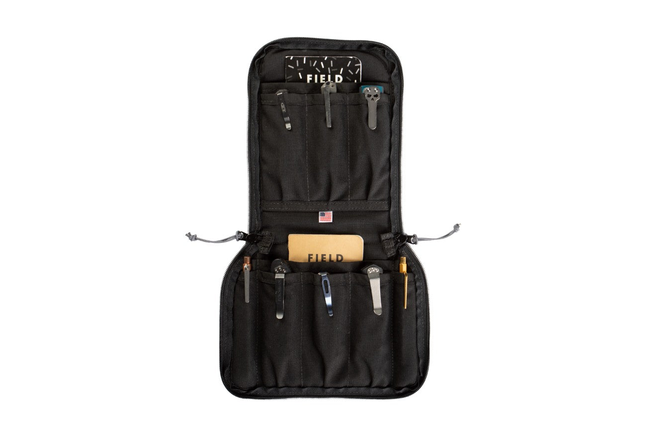 Infinity Knife Collector Pouch is a storage and carriage solution for the discerning knife collector. It holds six folding knives, two pens and two notebooks. The staggered design ensures the pocket clips stay protected and scratch free.