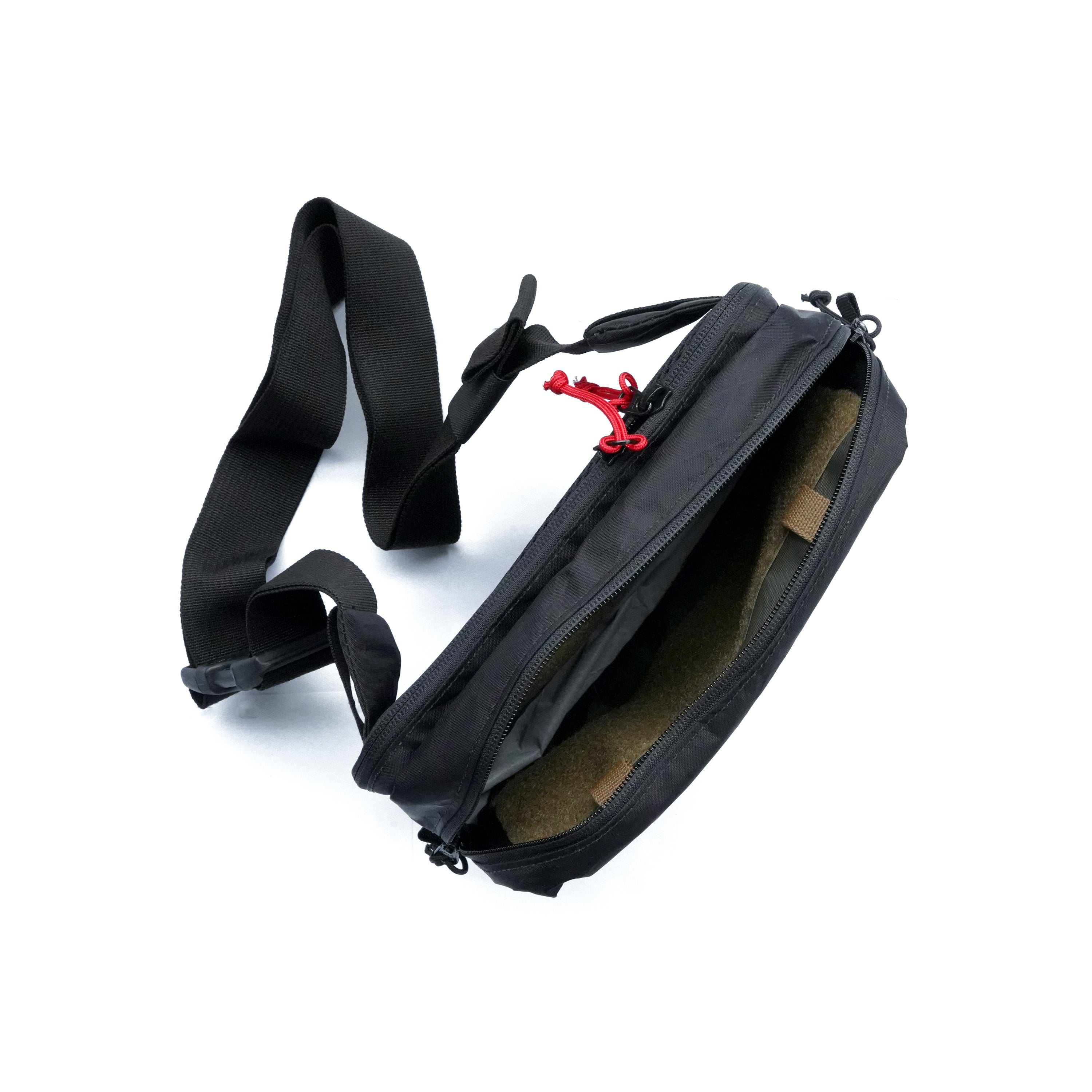 The rear compartment opens wide on three sides for fast access, whether you’re wearing it as a sling across your chest or as a hip pack. The interior is fully loop-lined, allowing you to mount organizers and tool keepers. The main compartment is also loop-lined on both sides, and has two loops on each side to mount carabiners.