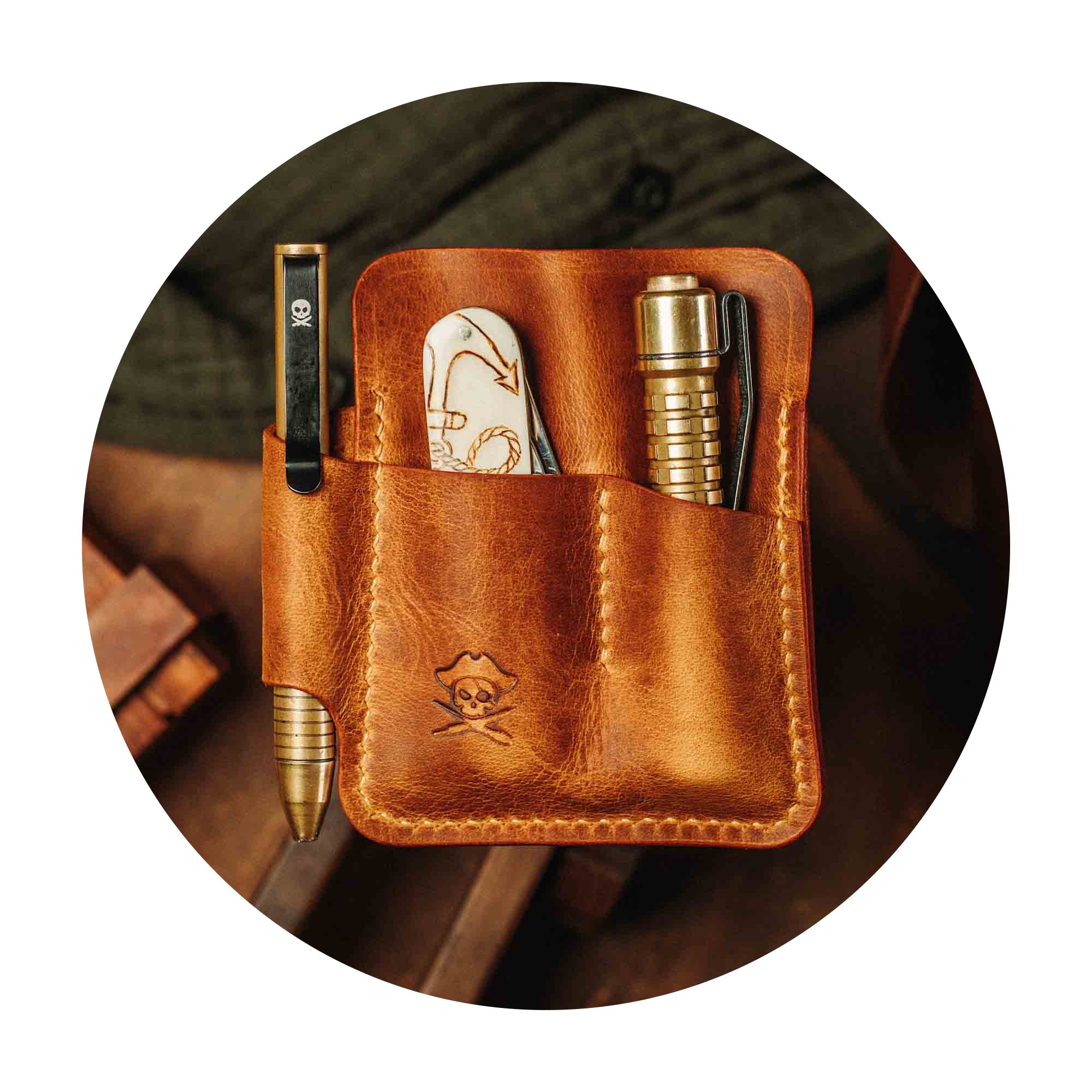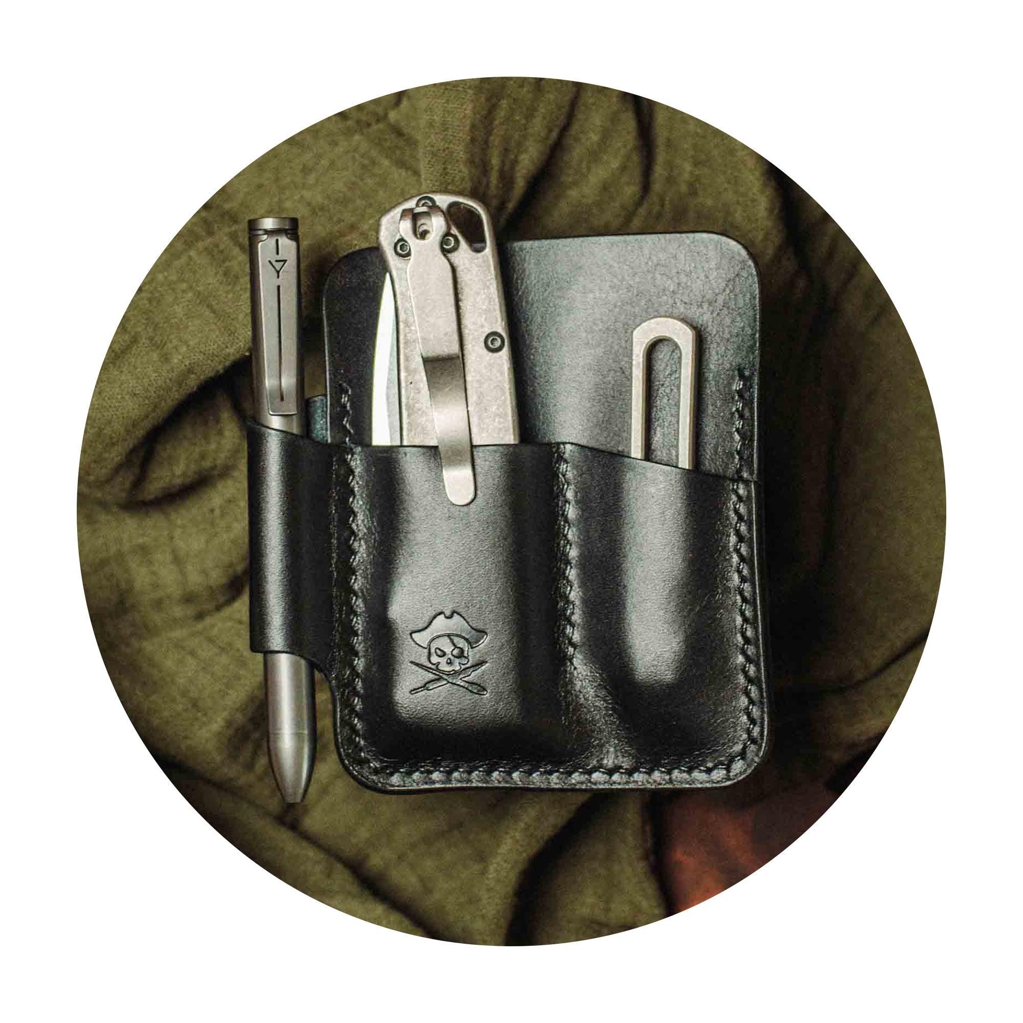 The First Mate is an EDC pocket organiser, designed to carry the most necessary items such as pen, small knife, and light all in one neat package. It also features a card pocket on the back and a pen loop on the side.