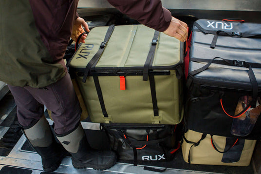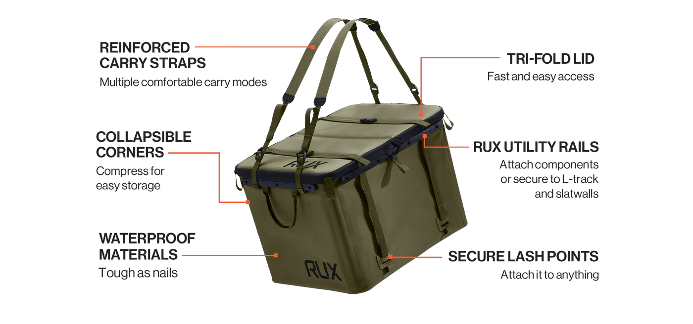 The original high-capacity gear hauler for hassle-free adventures in all conditions. The RUX 70L is part bag, part box, A rugged, compressible, weatherproof soft sided gear storage container with a wide rigid opening for easy access, a secure, stowable lid and modular straps for easy carry. RUX saves time and space every step of the way from garage, to truck, to trailhead and beyond.