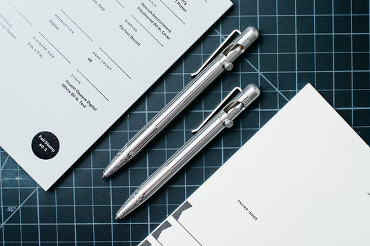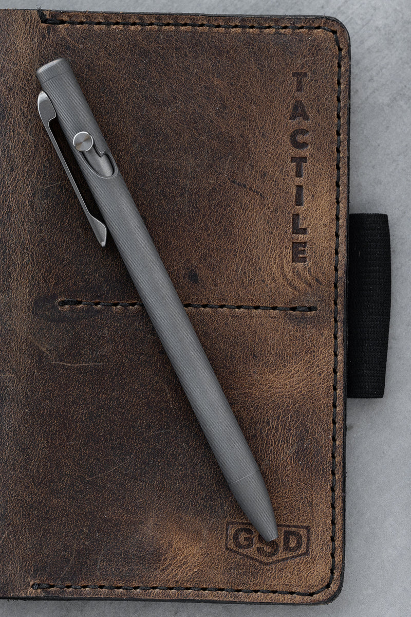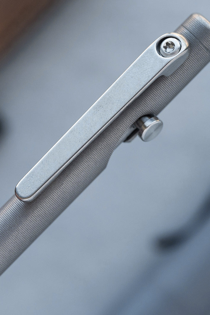 After the popularity of the Stonewashed Titanium Bolt Action and Side Click pens, Tactile Turn decided to expand the darker, matte finish to the slim versions. The tumbled look on the body contrasts nicely with the shiny titanium clip, screw, and bolt.