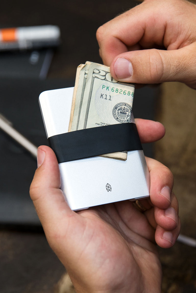 • Pinch-Tech locks in up to six cards, while the silicone band flexes for cash