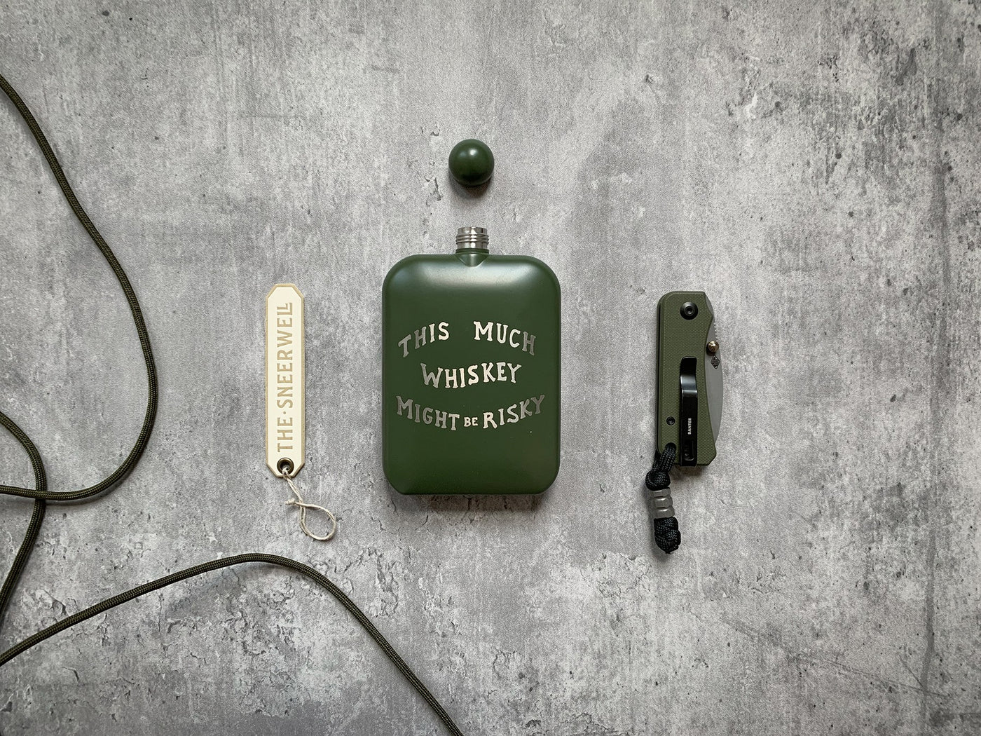 For sharing a moment, toasting to good health and prosperity, to celebrate a milestone - we can't think of a more appropriate vessel of emotion than the beautifully crafted Sneerwell flask. Each flask in the Perdition line is made of sturdy food-safe stainless steel, featuring a hand-etched design and a smooth olive drab finish.